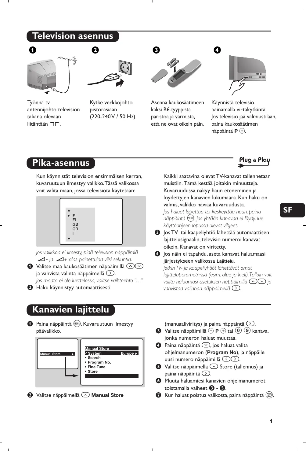 jos valikkoa ei ilmesty, pidä television näppäimiä ”- ja ”+ alas painettuina viisi sekuntia. & Valitse maa kaukosäätimen näppäimillä îÏ ja vahvista valinta näppäimellä ¬. Jos maata ei ole luettelossa, valitse vaihtoehto “. . .” é Haku käynnistyy automaattisesti. Kaikki saatavina olevat TV-kanavat tallennetaan muistiin. Tämä kestää joitakin minuutteja. Kuvaruudussa näkyy haun eteneminen ja löydettyjen kanavien lukumäärä. Kun haku on valmis, valikko häviää kuvaruudusta. Jos haluat lopettaa tai keskeyttää haun, paina näppäintä H. Jos yhtään kanavaa ei löydy, lue käyttöohjeen lopussa olevat vihjeet. “ Jos TV- tai kaapeliyhtiö lähettää automaattisen lajittelusignaalin, televisio numeroi kanavat oikein. Kanavat on viritetty. ‘ Jos näin ei tapahdu, aseta kanavat haluamaasi järjestykseen valikossa Lajittelu. Jotkin TV- ja kaapeliyhtiöt lähettävät omat lajitteluparametrinsä (esim. alue ja kieli).Tällöin voit valita haluamasi asetuksen näppäimillä îÏ ja vahvistaa valinnan näppäimellä ¬. Kanavien lajittelu & Paina näppäintä H. Kuvaruutuun ilmestyy päävalikko. Manual Store