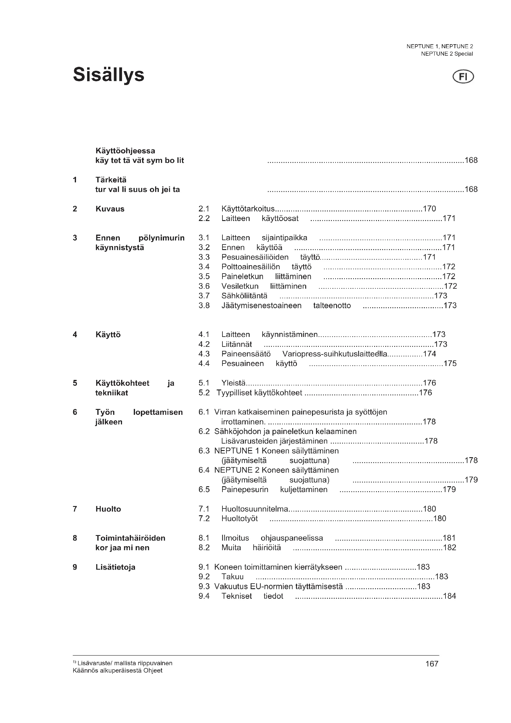 Lisävaruste/ mallista riippuvainen Käännös alkuperäisestä Ohjeet NEPTUNE 1, NEPTUNE 2 NEPTUNE 2 Special Käyttöohjeessa käy tet tä vät sym bo lit 1 Tärkeitä tur val li suus oh jei ta 2 Kuvaus 3 Ennen pölynimurin käynnistystä 4 Käyttö 5 Käyttökohteet ja tekniikat 6 Työn lopettamisen jälkeen 7 Huolto 8 Toimintahäiröiden kor jaa mi nen 9 Lisätietoja Sisällys