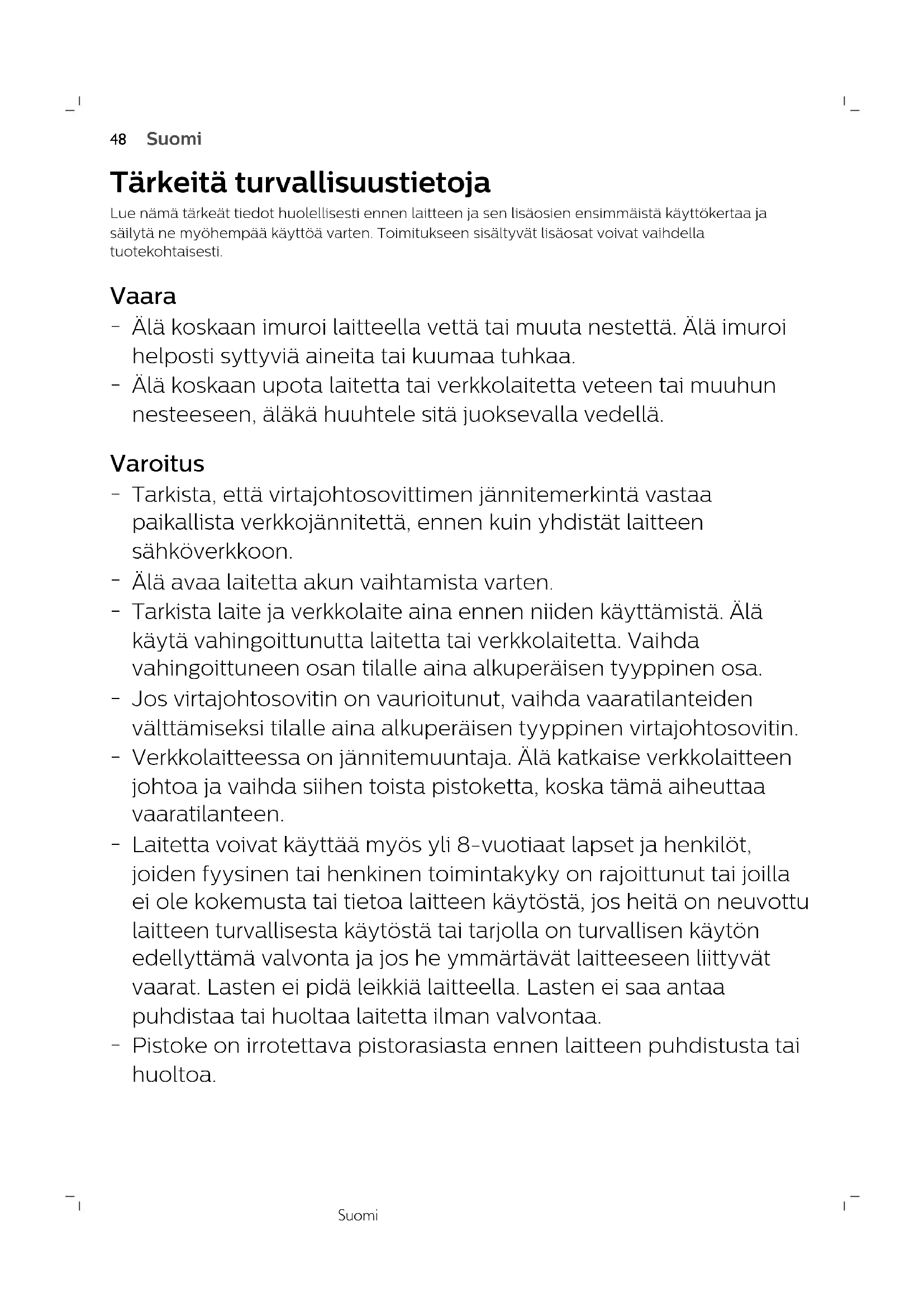 Laitetta voivat käyttää myös yli 8-vuotiaat lapset ja henkilöt, joiden fyysinen tai henkinen toimintakyky on rajoittunut tai joilla ei ole kokemusta tai tietoa laitteen käytöstä, jos heitä on neuvottu laitteen turvallisesta käytöstä tai tarjolla on turvallisen käytön edellyttämä valvonta ja jos he ymmärtävät laitteeseen liittyvät vaarat. Lasten ei pidä leikkiä laitteella. Lasten ei saa antaa puhdistaa tai huoltaa laitetta ilman valvontaa.