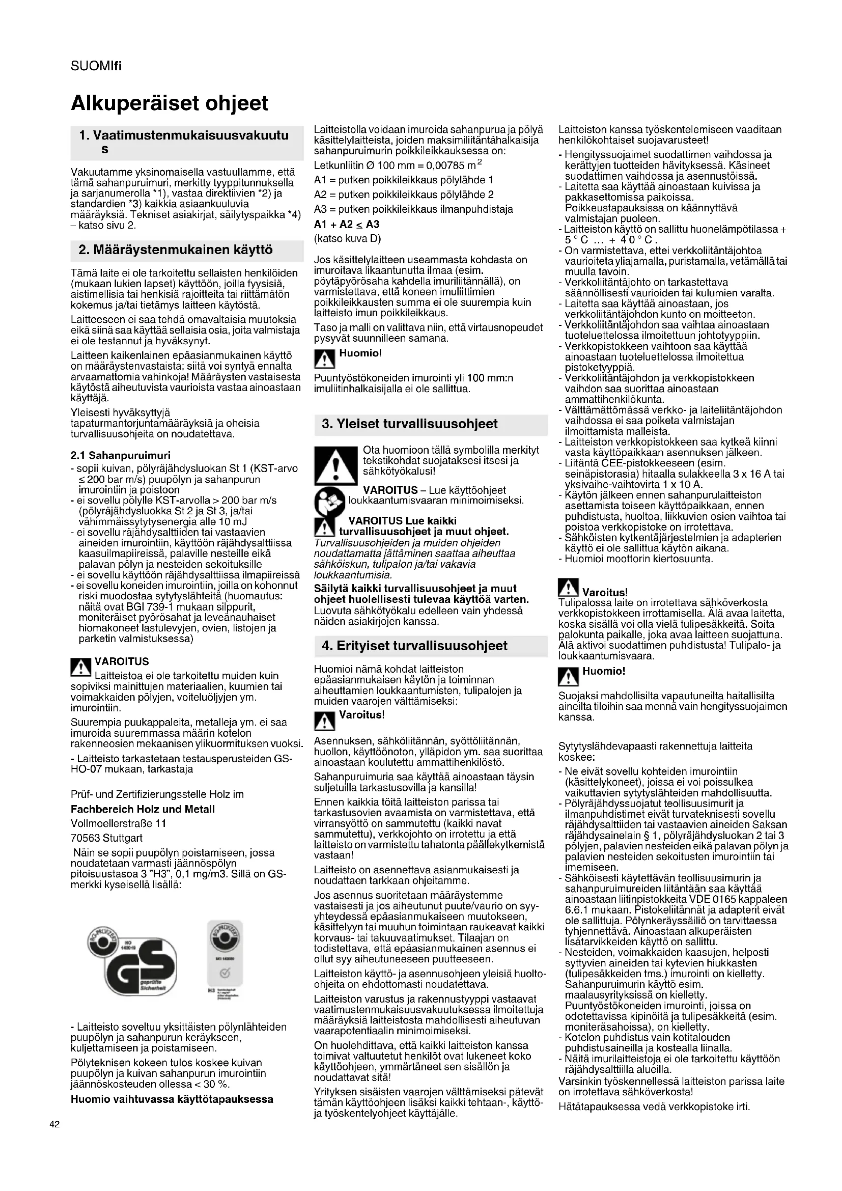 200 bar m/s) puupölyn ja sahanpurun imurointiin ja poistoon - ei sovellu pölylle KST-arvolla > 200 bar m/s (pölyräjähdysluokka St 2 ja St 3, ja/tai vähimmäissytytysenergia alle 10 mJ - ei sovellu räjähdysalttiiden tai vastaavien aineiden imurointiin, käyttöön räjähdysalttiissa kaasuilmapiireissä, palaville nesteille eikä palavan pölyn ja nesteiden sekoituksille - ei sovellu käyttöön räjähdysalttiissa ilmapiireissä - ei sovellu koneiden imurointiin, joilla on kohonnut riski muodostaa sytytyslähteitä (huomautus: näitä ovat BGI 739-1 mukaan silppurit, moniteräiset pyörösahat ja leveänauhaiset hiomakoneet lastulevyjen, ovien, listojen ja parketin valmistuksessa) VAROITUS Laitteistoa ei ole tarkoitettu muiden kuin sopiviksi mainittujen materiaalien, kuumien tai voimakkaiden pölyjen, voiteluöljyjen ym. imurointiin. Suurempia puukappaleita, metalleja ym. ei saa imuroida suuremmassa määrin kotelon rakenneosien mekaanisen ylikuormituksen vuoksi. - Laitteisto tarkastetaan testausperusteiden GS- HO-07 mukaan, tarkastaja Prüf- und Zertifizierungsstelle Holz im Fachbereich Holz und Metall Vollmoellerstraße 11 70563 Stuttgart Näin se sopii puupölyn poistamiseen, jossa noudatetaan varmasti jäännöspölyn pitoisuustasoa 3 ”H3”, 0,1 mg/m3. Sillä on GS- merkki kyseisellä lisällä: - Laitteisto soveltuu yksittäisten pölynlähteiden puupölyn ja sahanpurun keräykseen, kuljettamiseen ja poistamiseen. Pölyteknisen kokeen tulos koskee kuivan puupölyn ja kuivan sahanpurun imurointiin jäännöskosteuden ollessa < 30 %. Huomio vaihtuvassa käyttötapauksessa Laitteistolla voidaan imuroida sahanpurua ja pölyä käsittelylaitteista, joiden maksimiliitäntähalkaisija sahanpuruimurin poikkileikkauksessa on: Letkunliitin Ø 100 mm = 0,00785 m