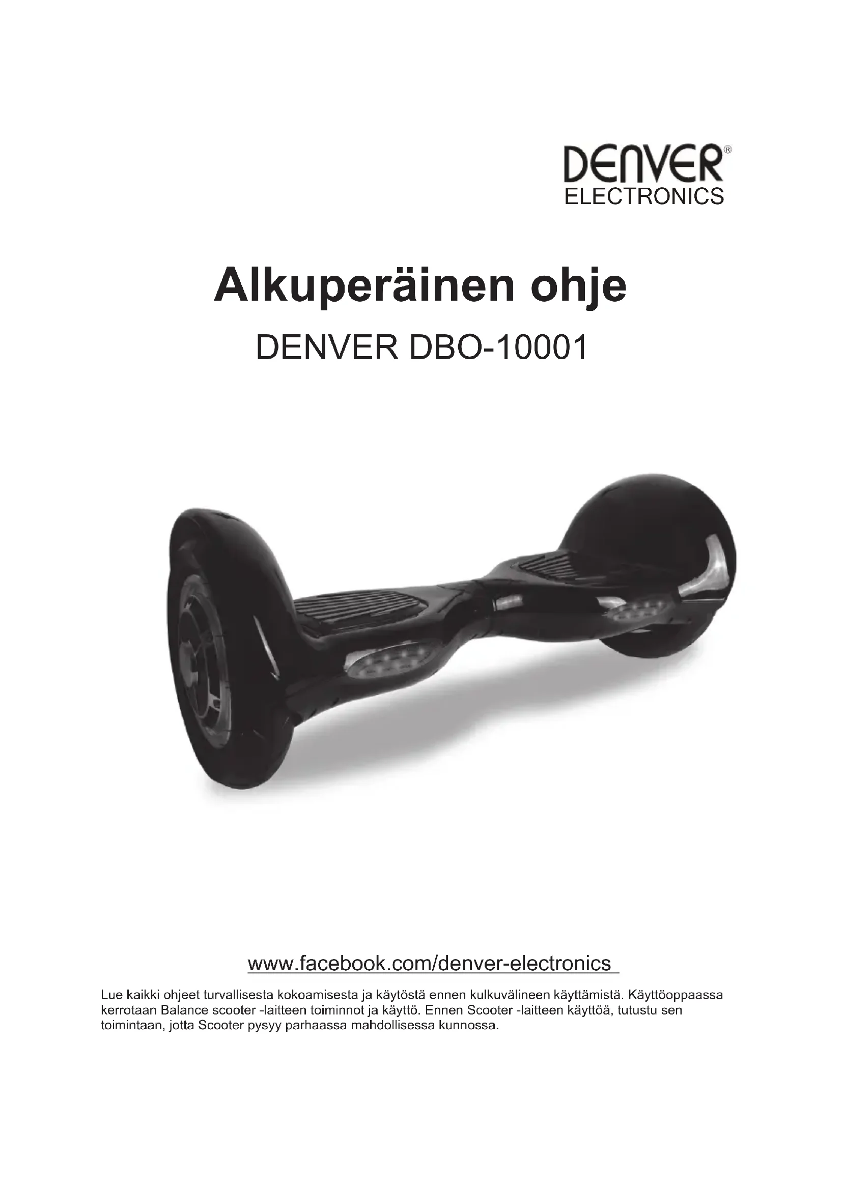 Danmark Omega 5A, Soeften, DK-8382 Hinnerup, SWE 8Alkuperäinen ohje DENVER DBO-10001 www.facebook.com/denver-electronics Lue kaikki ohjeet turvallisesta kokoamisesta ja käytöstä ennen kulkuvälineen käyttämistä. Käyttöoppaassa kerrotaan Balance scooter -laitteen toiminnot ja käyttö. Ennen Scooter -laitteen käyttöä, tutustu sen toimintaan, jotta Scooter pysyy parhaassa mahdollisessa kunnossa.
