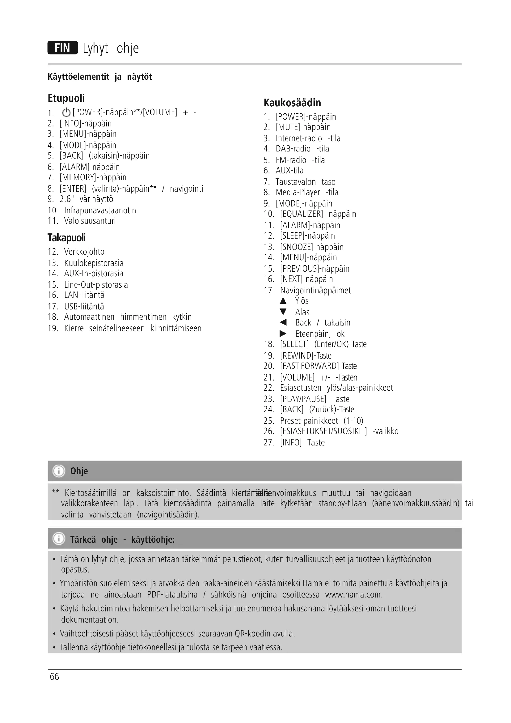 Ohje ** Kiertosäätimillä on kaksoistoiminto. Säädintä kiertämällä äänenvoimakkuus muuttuu tai navigoidaan valikkorakenteen läpi. Tätä kiertosäädintä painamalla laite kytketään standby-tilaan (äänenvoimakkuussäädin) tai valinta vahvistetaan (navigointisäädin). Tärkeä ohje - käyttöohje: