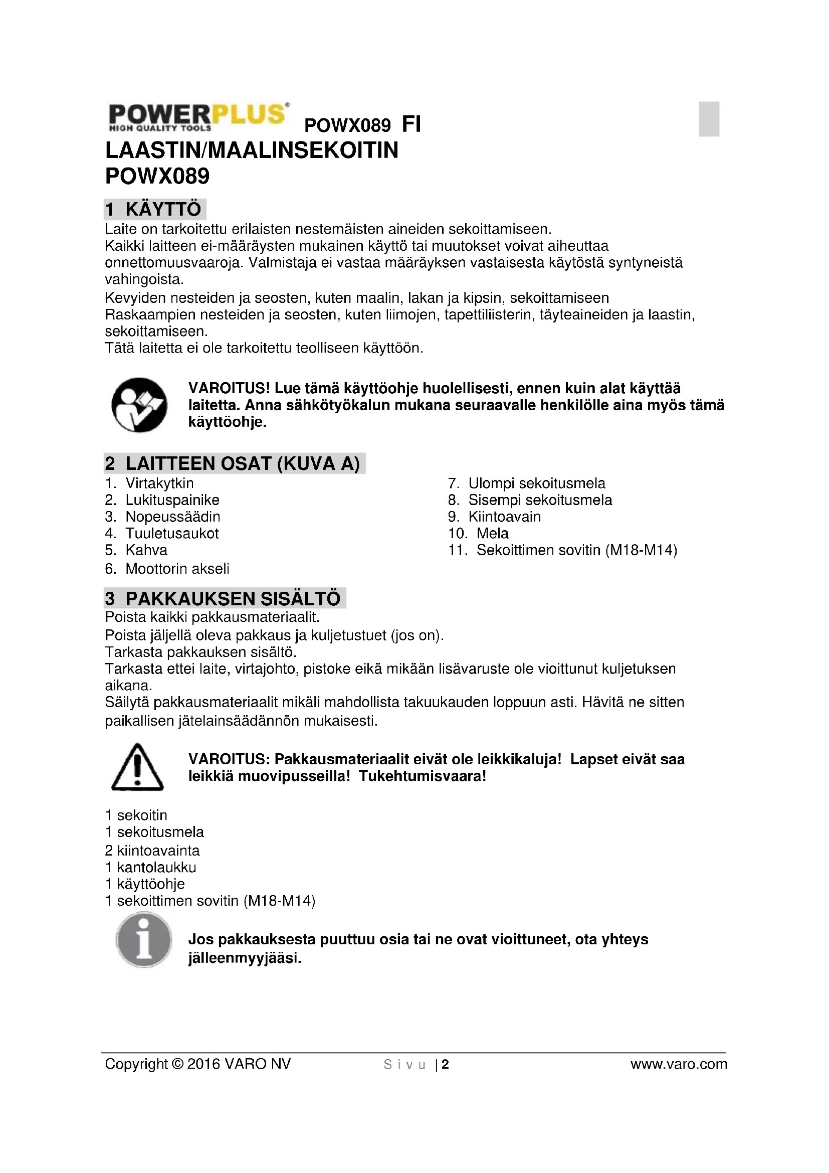 Copyright © 2016 VARO NV S i v u | 2 www.varo.com LAASTIN/MAALINSEKOITIN POWX089 1 KÄYTTÖ Laite on tarkoitettu erilaisten nestemäisten aineiden sekoittamiseen. Kaikki laitteen ei-määräysten mukainen käyttö tai muutokset voivat aiheuttaa onnettomuusvaaroja. Valmistaja ei vastaa määräyksen vastaisesta käytöstä syntyneistä vahingoista. Kevyiden nesteiden ja seosten, kuten maalin, lakan ja kipsin, sekoittamiseen Raskaampien nesteiden ja seosten, kuten liimojen, tapettiliisterin, täyteaineiden ja laastin, sekoittamiseen. Tätä laitetta ei ole tarkoitettu teolliseen käyttöön. VAROITUS! Lue tämä käyttöohje huolellisesti, ennen kuin alat käyttää laitetta. Anna sähkötyökalun mukana seuraavalle henkilölle aina myös tämä käyttöohje. 2 LAITTEEN OSAT (KUVA A)