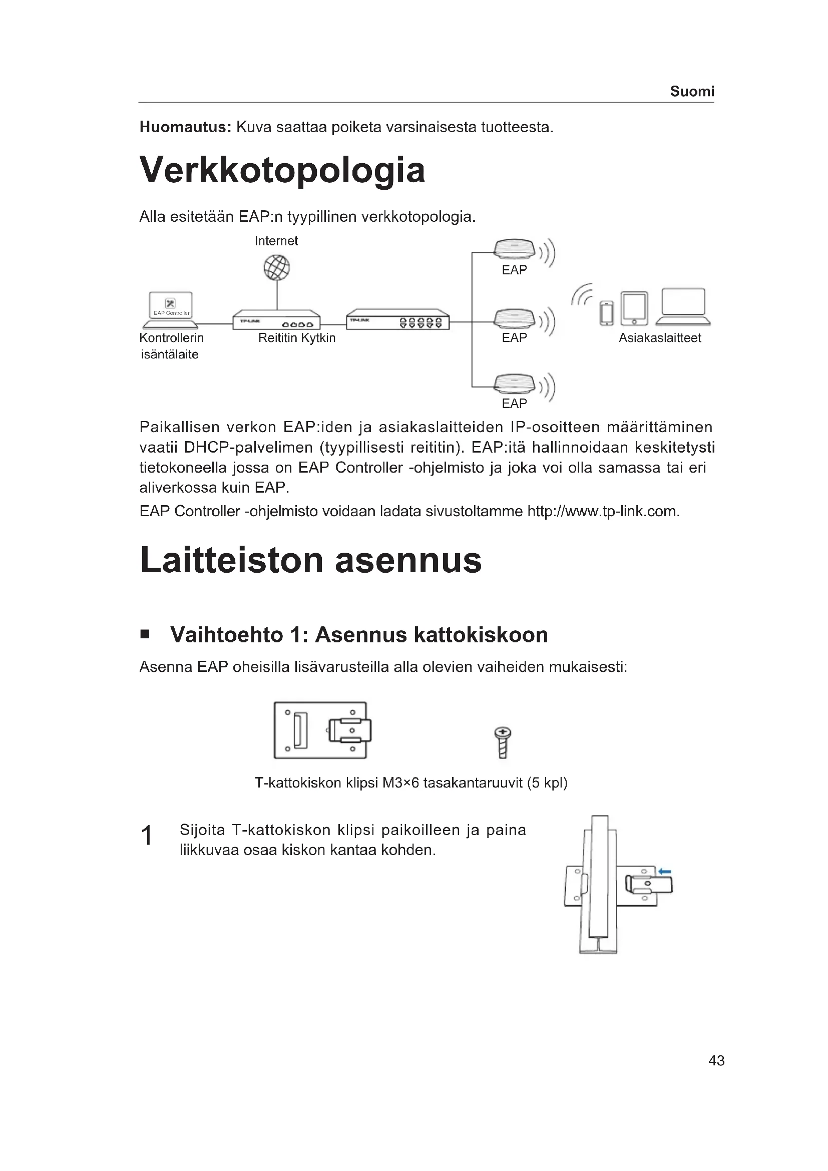 Sijoita T-kattokiskon klipsi paikoilleen ja paina liikkuvaa osaa kiskon kantaa kohden. Kontrollerin isäntälaiteReititin KytkinAsiakaslaitteet T-kattokiskon klipsi M3×6 tasakantaruuvit (5 kpl) Internet EAP EAP EAP44 Suomi