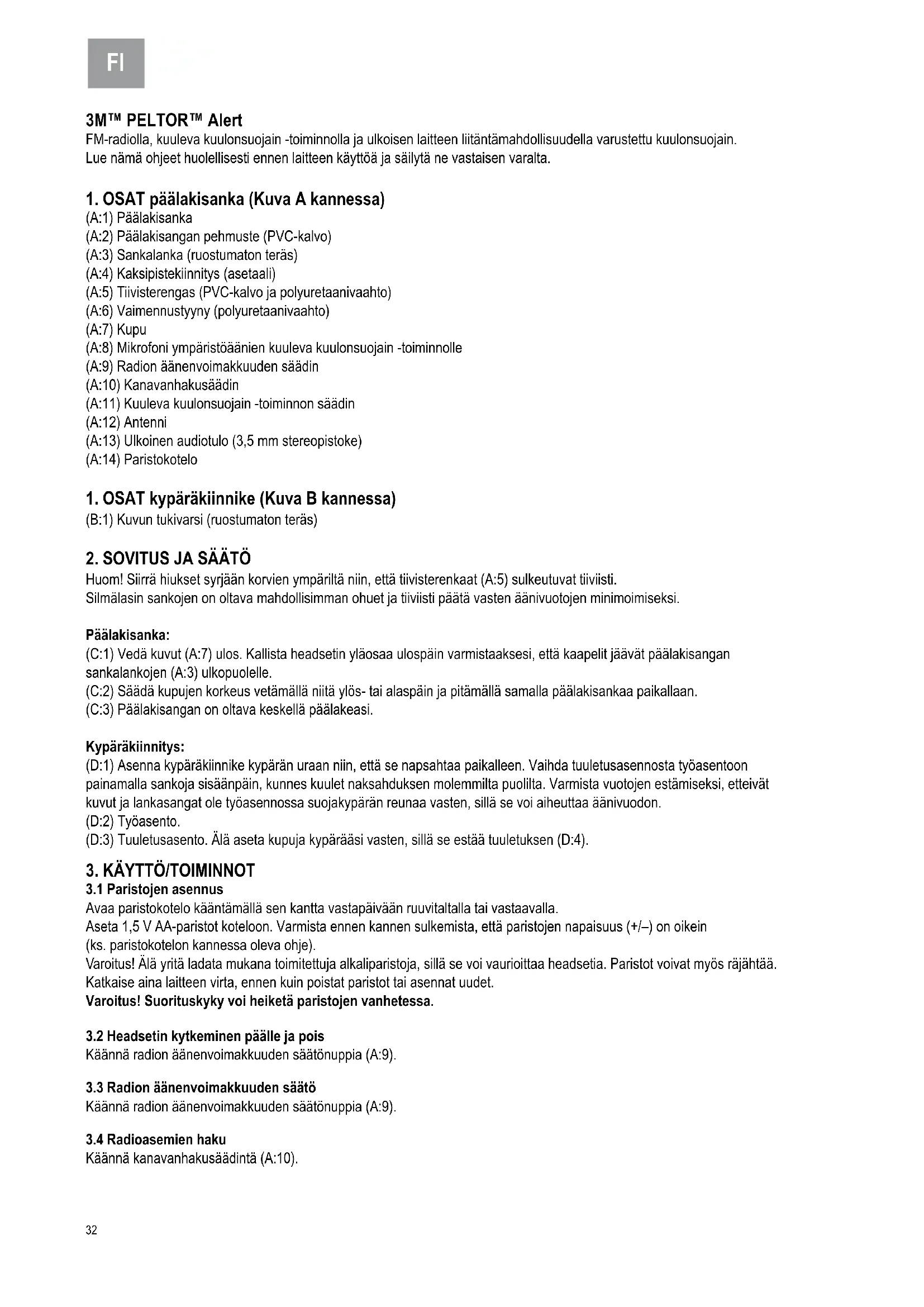 3M™ PELTOR™ Alert FM-radiolla, kuuleva kuulonsuojain -toiminnolla ja ulkoisen laitteen liitäntämahdollisuudella varustettu kuulonsuojain. Lue nämä ohjeet huolellisesti ennen laitteen käyttöä ja säilytä ne vastaisen varalta.