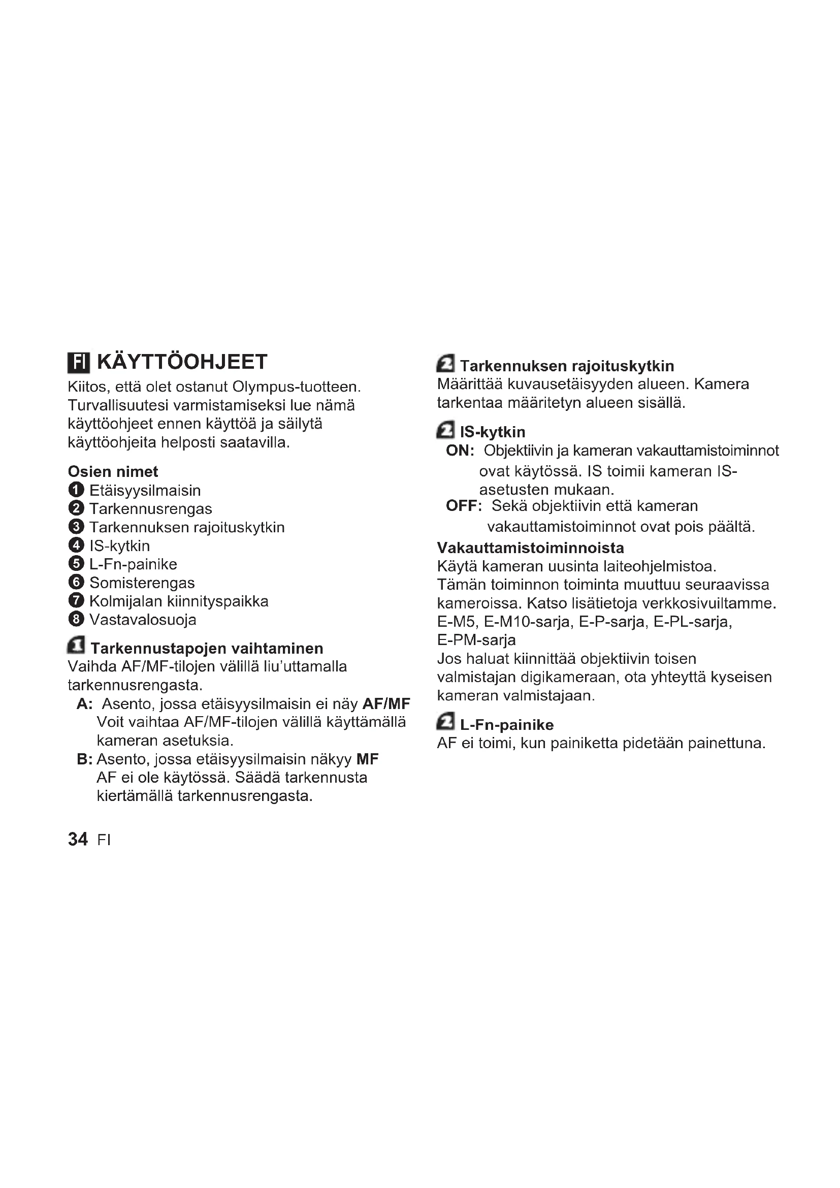 Kiitos, että olet ostanut Olympus-tuotteen. Turvallisuutesi varmistamiseksi lue nämä käyttöohjeet ennen käyttöä ja säilytä käyttöohjeita helposti saatavilla. Osien nimet 1 Etäisyysilmaisin 2 Tarkennusrengas 3 Tarkennuksen rajoituskytkin 4 IS-kytkin 5 L-Fn-painike 6 Somisterengas 7 Kolmijalan kiinnityspaikka 8 Vastavalosuoja Tarkennustapojen vaihtaminen Vaihda AF/MF-tilojen välillä liu’uttamalla tarkennusrengasta. A: Asento, jossa etäisyysilmaisin ei näy AF/MF Voit vaihtaa AF/MF-tilojen välillä käyttämällä kameran asetuksia. B: Asento, jossa etäisyysilmaisin näkyy MF AF ei ole käytössä. Säädä tarkennusta kiertämällä tarkennusrengasta. Tarkennuksen rajoituskytkin Määrittää kuvausetäisyyden alueen. Kamera tarkentaa määritetyn alueen sisällä. IS-kytkin ON: Objektiivin ja kameran vakauttamistoiminnot ovat käytössä. IS toimii kameran IS- asetusten mukaan. OFF: Sekä objektiivin että kameran vakauttamistoiminnot ovat pois päältä. Vakauttamistoiminnoista Käytä kameran uusinta laiteohjelmistoa. Tämän toiminnon toiminta muuttuu seuraavissa kameroissa. Katso lisätietoja verkkosivuiltamme. E-M5, E-M10-sarja, E-P-sarja, E-PL-sarja, E-PM-sarja Jos haluat kiinnittää objektiivin toisen valmistajan digikameraan, ota yhteyttä kyseisen kameran valmistajaan. L-Fn-painike AF ei toimi, kun painiketta pidetään painettuna. FIFI 35 Kolmijalan kiinnityspaikan irrottaminen ja somisterenkaan kiinnittäminen Kolmijalan kiinnityspaikan irrottaminen: Käännä kolmijalan kiinnityspaikan nuppia vasemmalle löysätäksesi sitä 1. Käännä kolmijalan kiinnityspaikkaa vasemmalle, kohdista se merkin 2 kanssa, ja irrota se objektiivin rungosta 3. Somisterenkaan kiinnittäminen: Kohdista merkit ja aseta somisterengas paikoilleen 1 ja käännä sitä sitten oikealle, kunnes se pysähtyy 2. Vastavalosuojan käyttö Vedä vastavalosuojaa ulospäin, kunnes se pysähtyy 1, ja käännä sitä sitten oikealle 2. Vastavalosuojaa ei voi irrottaa objektiivista. Ota huomioon kuvatessasi