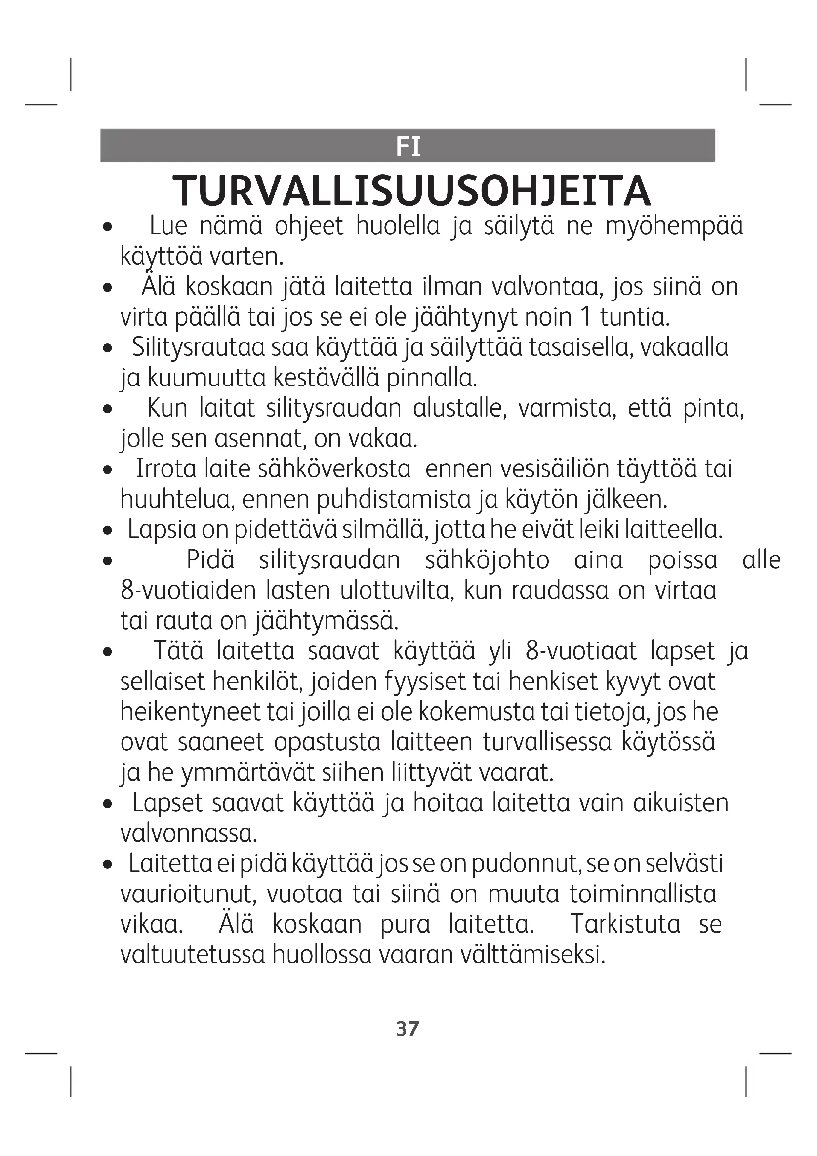 - Laitetta ei pidä käyttää jos se on pudonnut, se on selvästi vaurioitunut, vuotaa tai siinä on muuta toiminnallista vikaa. Älä koskaan pura laitetta. Tarkistuta se valtuutetussa huollossa vaaran välttämiseksi. 37Tällä merkillä varustetut pinnat ja pohjalevy tulevat hyvin kuumiksi laitteen käytön aikana. Älä koske näihin pintoihin, ennen kuin silitysrauta on jäähtynyt.