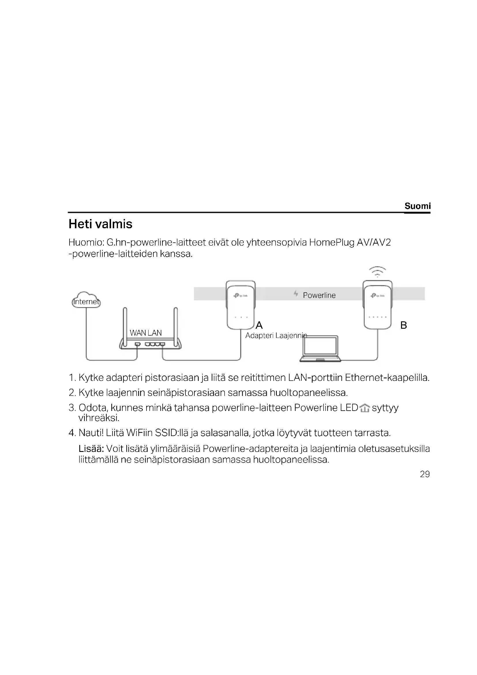 Heti valmis Huomio: G.hn-powerline-laitteet eivät ole yhteensopivia HomePlug AV/AV2 -powerline-laitteiden kanssa. A B