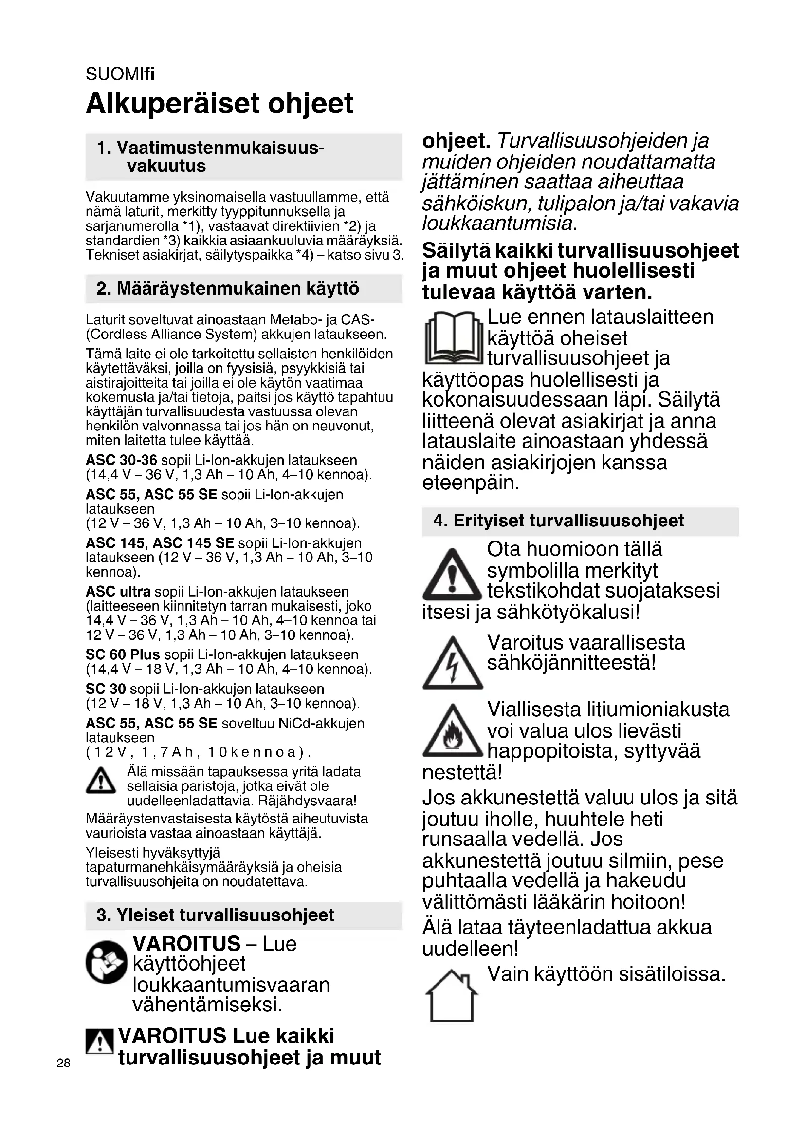 Alkuperäiset ohjeet Vakuutamme yksinomaisella vastuullamme, että nämä laturit, merkitty tyyppitunnuksella ja sarjanumerolla *1), vastaavat direktiivien *2) ja standardien *3) kaikkia asiaankuuluvia määräyksiä. Tekniset asiakirjat, säilytyspaikka *4) – katso sivu 3. Laturit soveltuvat ainoastaan Metabo- ja CAS- (Cordless Alliance System) akkujen lataukseen. Tämä laite ei ole tarkoitettu sellaisten henkilöiden käytettäväksi, joilla on fyysisiä, psyykkisiä tai aistirajoitteita tai joilla ei ole käytön vaatimaa kokemusta ja/tai tietoja, paitsi jos käyttö tapahtuu käyttäjän turvallisuudesta vastuussa olevan henkilön valvonnassa tai jos hän on neuvonut, miten laitetta tulee käyttää. ASC 30-36 sopii Li-Ion-akkujen lataukseen (14,4 V – 36 V, 1,3 Ah – 10 Ah, 4–10 kennoa). ASC 55, ASC 55 SE sopii Li-Ion-akkujen lataukseen (12 V – 36 V, 1,3 Ah – 10 Ah, 3–10 kennoa). ASC 145, ASC 145 SE sopii Li-Ion-akkujen lataukseen (12 V – 36 V, 1,3 Ah – 10 Ah, 3–10 kennoa). ASC ultra sopii Li-Ion-akkujen lataukseen (laitteeseen kiinnitetyn tarran mukaisesti, joko 14,4 V – 36 V, 1,3 Ah – 10 Ah, 4–10 kennoa tai 12 V – 36 V, 1,3 Ah – 10 Ah, 3–10 kennoa). SC 60 Plus sopii Li-Ion-akkujen lataukseen (14,4 V – 18 V, 1,3 Ah – 10 Ah, 4–10 kennoa). SC 30 sopii Li-Ion-akkujen lataukseen (12 V – 18 V, 1,3 Ah – 10 Ah, 3–10 kennoa). ASC 55, ASC 55 SE soveltuu NiCd-akkujen lataukseen (12V, 1,7Ah, 10kennoa). Älä missään tapauksessa yritä ladata sellaisia paristoja, jotka eivät ole uudelleenladattavia. Räjähdysvaara! Määräystenvastaisesta käytöstä aiheutuvista vaurioista vastaa ainoastaan käyttäjä. Yleisesti hyväksyttyjä tapaturmanehkäisymääräyksiä ja oheisia turvallisuusohjeita on noudatettava. VAROITUS – Lue käyttöohjeet loukkaantumisvaaran vähentämiseksi. VAROITUS Lue kaikki turvallisuusohjeet ja muut ohjeet. Turvallisuusohjeiden ja muiden ohjeiden noudattamatta jättäminen saattaa aiheuttaa sähköiskun, tulipalon ja/tai vakavia loukkaantumisia. Säilytä kaikki turvallisuusohjeet ja muut ohjeet huolellisesti tulevaa käyttöä varten. Lue ennen latauslaitteen käyttöä oheiset turvallisuusohjeet ja käyttöopas huolellisesti ja kokonaisuudessaan läpi. Säilytä liitteenä olevat asiakirjat ja anna latauslaite ainoastaan yhdessä näiden asiakirjojen kanssa eteenpäin. Ota huomioon tällä symbolilla merkityt tekstikohdat suojataksesi itsesi ja sähkötyökalusi! Varoitus vaarallisesta sähköjännitteestä! Viallisesta litiumioniakusta voi valua ulos lievästi happopitoista, syttyvää nestettä! Jos akkunestettä valuu ulos ja sitä joutuu iholle, huuhtele heti runsaalla vedellä. Jos akkunestettä joutuu silmiin, pese puhtaalla vedellä ja hakeudu välittömästi lääkärin hoitoon! Älä lataa täyteenladattua akkua uudelleen! Vain käyttöön sisätiloissa.