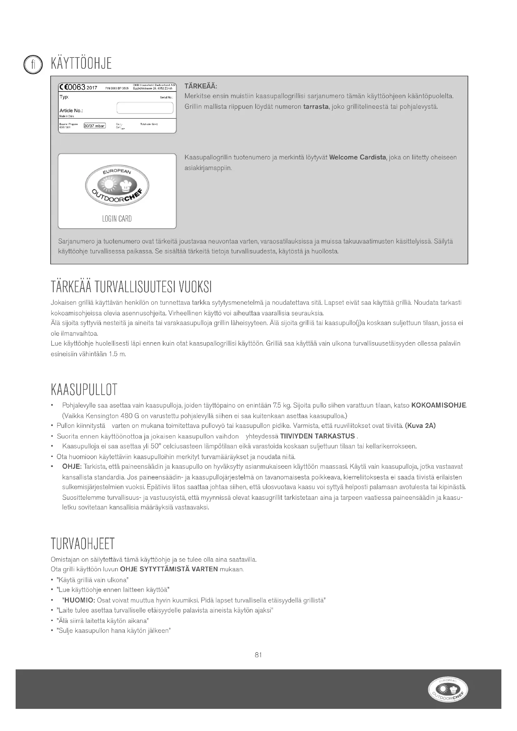 Lue käyttöohje huolellisesti läpi, ennen kuin otat OUTDOORCHEF-kaasupallogrillin käyttöön.
