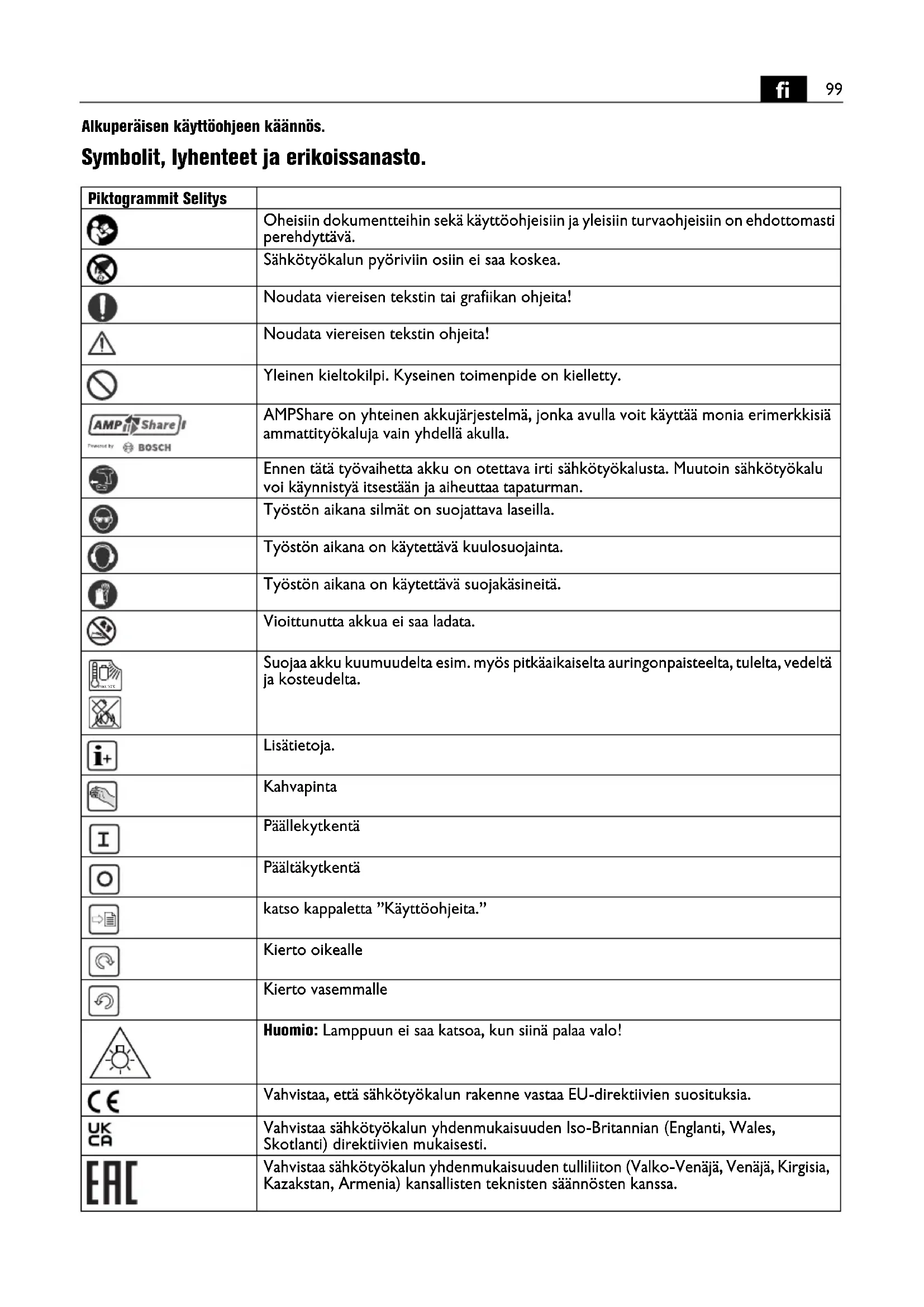 | EAC | Vahvistaa sähkötyökalun yhdenmukaisuuden tulliliiton (Valko-Venäjä, Venäjä, Kirgisia, Kazakhstan, Armenia) kansallisten teknisten säännösten kanssa. |