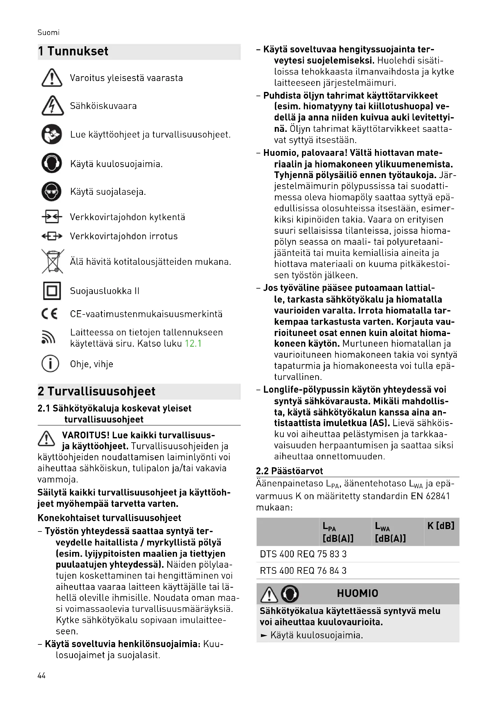 HUOMIO Päästöarvot saattavat poiketa ilmoitetuista arvoista. Ne riippuvat työkalun käyttötavasta ja työkappaleen laadusta. ► Arvioi todellinen rasitus koko käyttöjakson aikana. ► Todellisesta kuormituksesta riippuen täy tyy määrittää asiaankuuluvat varotoimenpi teet käyttöturvallisuuden takaamiseksi. 3 Määräystenmukainen käyttö Hiomakoneet on tarkoitettu puun, muovin, komposiittimateriaalien, maali-/lakkapintojen, tasoitepintojen ja muiden vastaavien materiaa lien hiomiseen. Niillä ei saa työstää metallia eikä asbestipitoisia materiaaleja. Sähköturvallisuuden takia kone ei saa olla kos tea eikä sitä saa käyttää kosteassa ympäristös sä. Konetta saa käyttää vain kuivahiomiseen. Koneen käyttäjä vastaa määräystenvas taisesta käytöstä aiheutuneista vahin goista. 4 Tekniset tiedot Tasohiomakone DTS 400REQ RTS 400REQ Teho 250 W 250 W Kierrosluku (kuormittamatta) 6000 - 12000 min