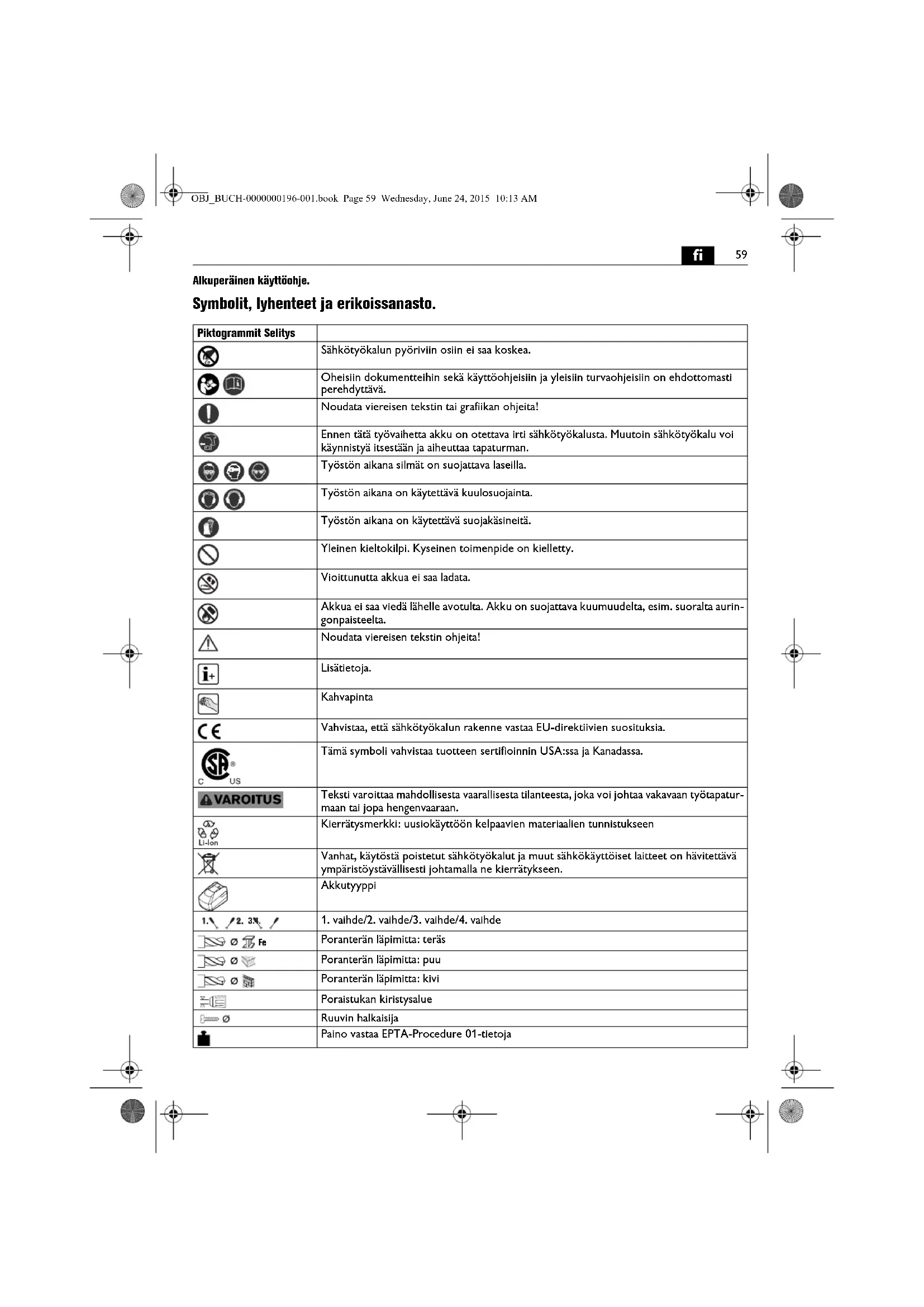 Alkuperäinen käyttöohje. Symbolit, lyhenteet ja erikoissanasto. Piktogrammit Selitys Sähkötyökalun pyöriviin osiin ei saa koskea. Oheisiin dokumentteihin sekä käyttöohjeisiin ja yleisiin turvaohjeisiin on ehdottomasti perehdyttävä. Noudata viereisen tekstin tai grafiikan ohjeita! Ennen tätä työvaihetta akku on otettava irti sähkötyökalusta. Muutoin sähkötyökalu voi käynnistyä itsestään ja aiheuttaa tapaturman. Työstön aikana silmät on suojattava laseilla. Työstön aikana on käytettävä kuulosuojainta. Työstön aikana on käytettävä suojakäsineitä. Yleinen kieltokilpi. Kyseinen toimenpide on kielletty. Vioittunutta akkua ei saa ladata. Akkua ei saa viedä lähelle avotulta. Akku on suojattava kuumuudelta, esim. suoralta aurin- gonpaisteelta. Noudata viereisen tekstin ohjeita! Lisätietoja. Kahvapinta Vahvistaa, että sähkötyökalun rakenne vastaa EU-direktiivien suosituksia. Tämä symboli vahvistaa tuotteen sertifioinnin USA:ssa ja Kanadassa. Teksti varoittaa mahdollisesta vaarallisesta tilanteesta, joka voi johtaa vakavaan työtapatur- maan tai jopa hengenvaaraan. Kierrätysmerkki: uusiokäyttöön kelpaavien materiaalien tunnistukseen Vanhat, käytöstä poistetut sähkötyökalut ja muut sähkökäyttöiset laitteet on hävitettävä ympäristöystävällisesti johtamalla ne kierrätykseen. Akkutyyppi