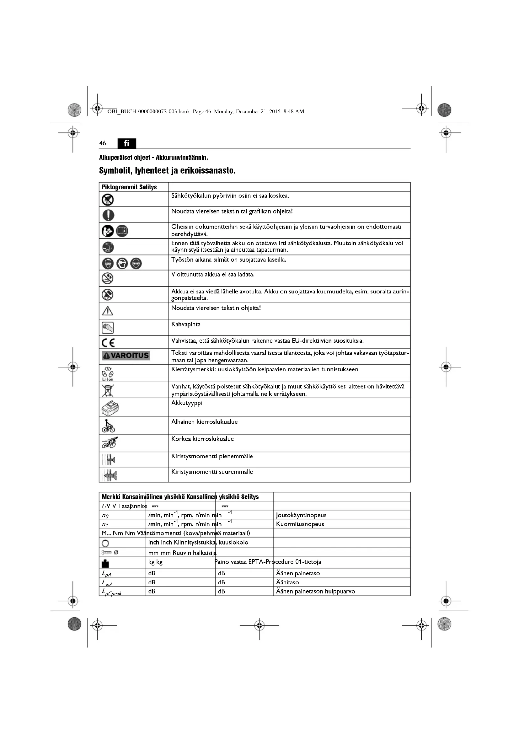 Alkuperäiset ohjeet - Akkuruuvinväännin. Symbolit, lyhenteet ja erikoissanasto. Piktogrammit Selitys Sähkötyökalun pyöriviin osiin ei saa koskea. Noudata viereisen tekstin tai grafiikan ohjeita! Oheisiin dokumentteihin sekä käyttöohjeisiin ja yleisiin turvaohjeisiin on ehdottomasti perehdyttävä. Ennen tätä työvaihetta akku on otettava irti sähkötyökalusta. Muutoin sähkötyökalu voi käynnistyä itsestään ja aiheuttaa tapaturman. Työstön aikana silmät on suojattava laseilla. Vioittunutta akkua ei saa ladata. Akkua ei saa viedä lähelle avotulta. Akku on suojattava kuumuudelta, esim. suoralta aurin- gonpaisteelta. Noudata viereisen tekstin ohjeita! Kahvapinta Vahvistaa, että sähkötyökalun rakenne vastaa EU-direktiivien suosituksia. Teksti varoittaa mahdollisesta vaarallisesta tilanteesta, joka voi johtaa vakavaan työtapatur- maan tai jopa hengenvaaraan. Kierrätysmerkki: uusiokäyttöön kelpaavien materiaalien tunnistukseen Vanhat, käytöstä poistetut sähkötyökalut ja muut sähkökäyttöiset laitteet on hävitettävä ympäristöystävällisesti johtamalla ne kierrätykseen. Akkutyyppi Alhainen kierroslukualue Korkea kierroslukualue Kiristysmomentti pienemmälle Kiristysmomentti suuremmalle Merkki Kansainvälinen yksikkö Kansallinen yksikkö Selitys U V V Tasajännite
