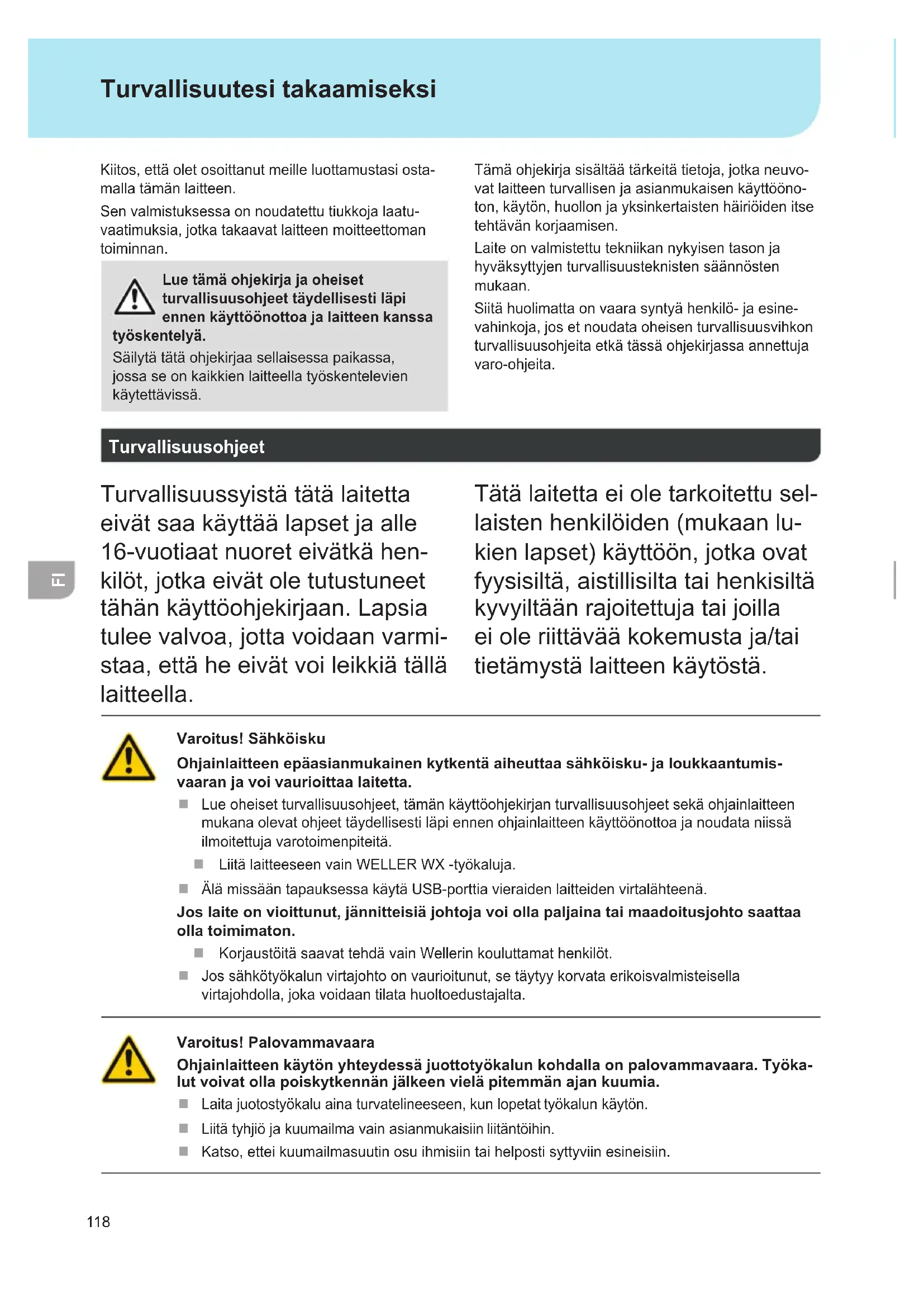Kiitos, että olet osoittanut meille luottamustasi osta- malla tämän laitteen. Sen valmistuksessa on noudatettu tiukkoja laatu- vaatimuksia, jotka takaavat laitteen moitteettoman toiminnan. Lue tämä ohjekirja ja oheiset turvallisuusohjeet täydellisesti läpi ennen käyttöönottoa ja laitteen kanssa työskentelyä. Säilytä tätä ohjekirjaa sellaisessa paikassa, jossa se on kaikkien laitteella työskentelevien käytettävissä. Tämä ohjekirja sisältää tärkeitä tietoja, jotka neuvo- vat laitteen turvallisen ja asianmukaisen käyttööno- ton, käytön, huollon ja yksinkertaisten häiriöiden itse tehtävän korjaamisen. Laite on valmistettu tekniikan nykyisen tason ja hyväksyttyjen turvallisuusteknisten säännösten mukaan. Siitä huolimatta on vaara syntyä henkilö- ja esine- vahinkoja, jos et noudata oheisen turvallisuusvihkon turvallisuusohjeita etkä tässä ohjekirjassa annettuja varo-ohjeita. Turvallisuusohjeet Turvallisuussyistä tätä laitetta eivät saa käyttää lapset ja alle 16-vuotiaat nuoret eivätkä hen- kilöt, jotka eivät ole tutustuneet tähän käyttöohjekirjaan. Lapsia tulee valvoa, jotta voidaan varmi- staa, että he eivät voi leikkiä tällä laitteella. Tätä laitetta ei ole tarkoitettu sel- laisten henkilöiden (mukaan lu- kien lapset) käyttöön, jotka ovat fyysisiltä, aistillisilta tai henkisiltä kyvyiltään rajoitettuja tai joilla ei ole riittävää kokemusta ja/tai tietämystä laitteen käytöstä. Varoitus! Sähköisku Ohjainlaitteen epäasianmukainen kytkentä aiheuttaa sähköisku- ja loukkaantumis- vaaran ja voi vaurioittaa laitetta. Lue oheiset turvallisuusohjeet, tämän käyttöohjekirjan turvallisuusohjeet sekä ohjainlaitteen mukana olevat ohjeet täydellisesti läpi ennen ohjainlaitteen käyttöönottoa ja noudata niissä ilmoitettuja varotoimenpiteitä. Liitä laitteeseen vain WELLER WX -työkaluja. Älä missään tapauksessa käytä USB-porttia vieraiden laitteiden virtalähteenä. Jos laite on vioittunut, jännitteisiä johtoja voi olla paljaina tai maadoitusjohto saattaa olla toimimaton. Korjaustöitä saavat tehdä vain Wellerin kouluttamat henkilöt. Jos sähkötyökalun virtajohto on vaurioitunut, se täytyy korvata erikoisvalmisteisella virtajohdolla, joka voidaan tilata huoltoedustajalta. Varoitus! Palovammavaara Ohjainlaitteen käytön yhteydessä juottotyökalun kohdalla on palovammavaara. Työka- lut voivat olla poiskytkennän jälkeen vielä pitemmän ajan kuumia. Laita juotostyökalu aina turvatelineeseen, kun lopetat työkalun käytön. Liitä tyhjiö ja kuumailma vain asianmukaisiin liitäntöihin. Katso, ettei kuumailmasuutin osu ihmisiin tai helposti syttyviin esineisiin. Turvallisuutesi takaamiseksi119