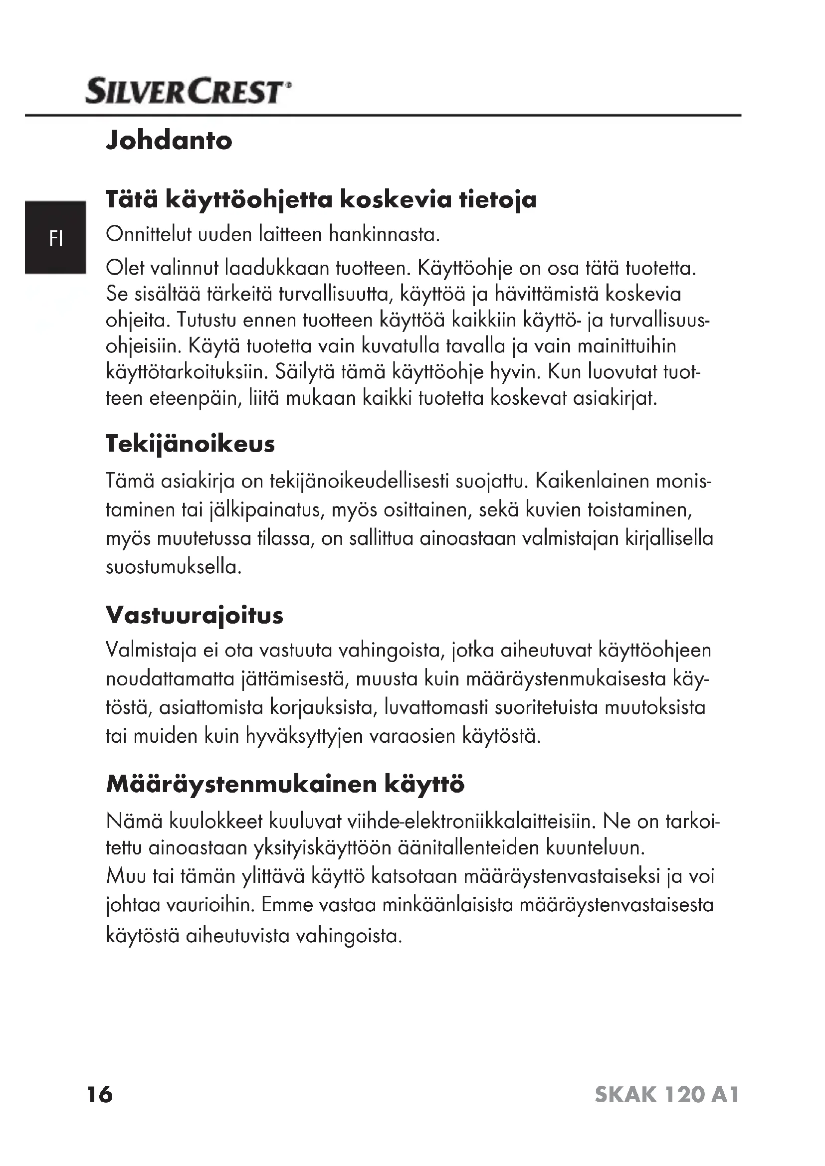 SKAK 120 A1 Johdanto Tätä käyttöohjetta koskevia tietoja Onnittelut uuden laitteen hankinnasta. Olet valinnut laadukkaan tuotteen. Käyttöohje on osa tätä tuotetta. Se sisältää tärkeitä turvallisuutta, käyttöä ja hävittämistä koskevia ohjeita. Tutustu ennen tuotteen käyttöä kaikkiin käyttö- ja turvallisuus- ohjeisiin. Käytä tuotetta vain kuvatulla tavalla ja vain mainittuihin käyttötarkoituksiin. Säilytä tämä käyttöohje hyvin. Kun luovutat tuot- teen eteenpäin, liitä mukaan kaikki tuotetta koskevat asiakirjat. Tekijänoikeus Tämä asiakirja on tekijänoikeudellisesti suojattu. Kaikenlainen monis- taminen tai jälkipainatus, myös osittainen, sekä kuvien toistaminen, myös muutetussa tilassa, on sallittua ainoastaan valmistajan kirjallisella suostumuksella. Vastuurajoitus Valmistaja ei ota vastuuta vahingoista, jotka aiheutuvat käyttöohjeen noudattamatta jättämisestä, muusta kuin määräystenmukaisesta käy- töstä, asiattomista korjauksista, luvattomasti suoritetuista muutoksista tai muiden kuin hyväksyttyjen varaosien käytöstä. Määräystenmukainen käyttö Nämä kuulokkeet kuuluvat viihde-elektroniikkalaitteisiin. Ne on tarkoi- tettu ainoastaan yksityiskäyttöön äänitallenteiden kuunteluun. Muu tai tämän ylittävä käyttö katsotaan määräystenvastaiseksi ja voi johtaa vaurioihin. Emme vastaa minkäänlaisista määräystenvastaisesta käytöstä aiheutuvista vahingoista. IB_106808_SKAK120A1_LB3.indb 16 27.11.14 14:2417 SKAK 120 A1