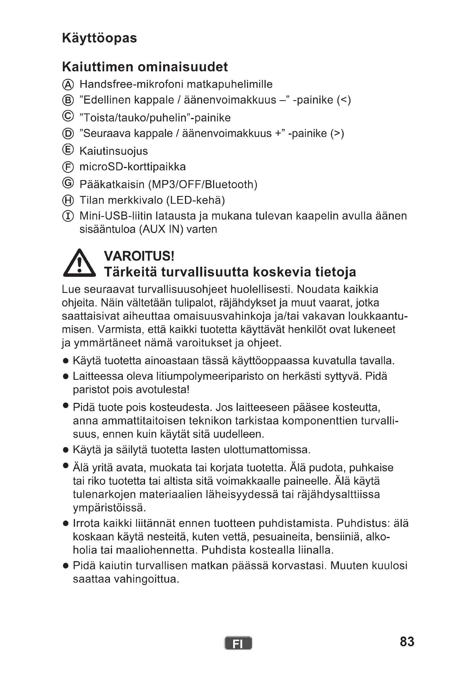 Mini-USB-liitin latausta ja mukana tulevan kaapelin avulla äänen sisääntuloa (AUX IN) varten VAROITUS! Tärkeitä turvallisuutta koskevia tietoja Lue seuraavat turvallisuusohjeet huolellisesti. Noudata kaikkia ohjeita. Näin vältetään tulipalot, räjähdykset ja muut vaarat, jotka saattaisivat aiheuttaa omaisuusvahinkoja ja/tai vakavan loukkaantu- misen. Varmista, että kaikki tuotetta käyttävät henkilöt ovat lukeneet ja ymmärtäneet nämä varoitukset ja ohjeet.