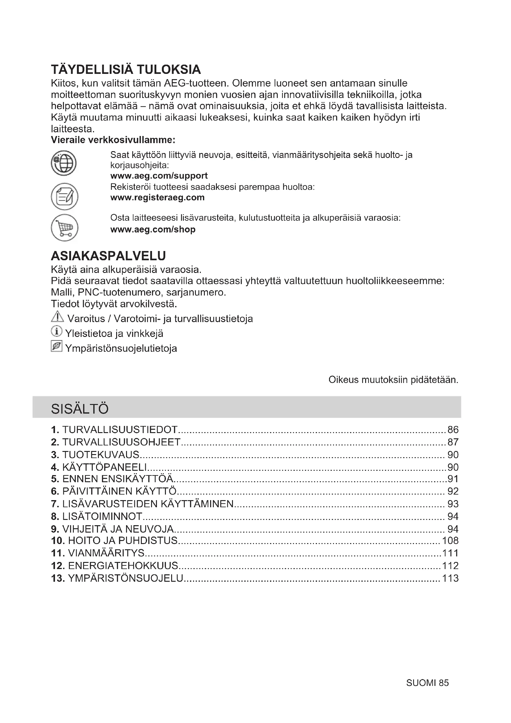 Kiitos, kun valitsit tämän AEG-tuotteen. Olemme luoneet sen antamaan sinulle moitteettoman suorituskyvyn monien vuosien ajan innovatiivisilla tekniikoilla, jotka helpottavat elämää – nämä ovat ominaisuuksia, joita et ehkä löydä tavallisista laitteista. Käytä muutama minuutti aikaasi lukeaksesi, kuinka saat kaiken kaiken hyödyn irti laitteesta. Vieraile verkkosivullamme: Saat käyttöön liittyviä neuvoja, esitteitä, vianmääritysohjeita sekä huolto- ja korjausohjeita: www.aeg.com/support Rekisteröi tuotteesi saadaksesi parempaa huoltoa: www.registeraeg.com Osta laitteeseesi lisävarusteita, kulutustuotteita ja alkuperäisiä varaosia: www.aeg.com/shop ASIAKASPALVELU Käytä aina alkuperäisiä varaosia. Pidä seuraavat tiedot saatavilla ottaessasi yhteyttä valtuutettuun huoltoliikkeeseemme: Malli, PNC-tuotenumero, sarjanumero. Tiedot löytyvät arvokilvestä. Varoitus / Varotoimi- ja turvallisuustietoja Yleistietoa ja vinkkejä Ympäristönsuojelutietoja Oikeus muutoksiin pidätetään. SISÄLTÖ