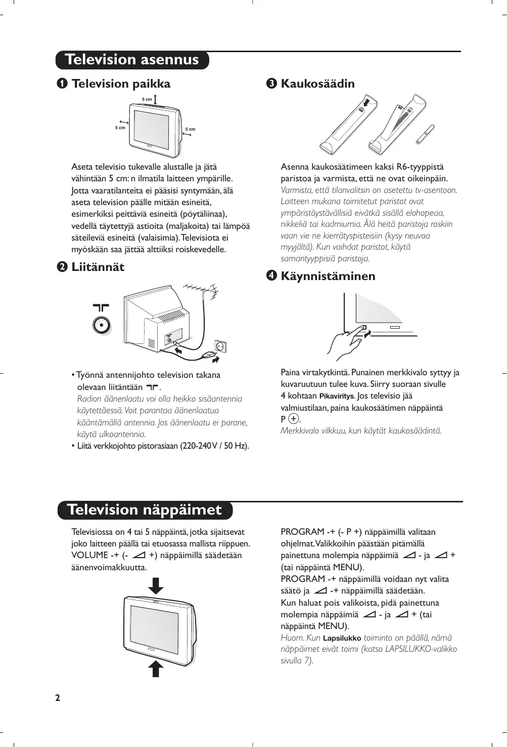 - Liitä verkkojohto pistorasiaan (220-240 V / 50 Hz). Asenna kaukosäätimeen kaksi R6-tyyppistä paristoa ja varmista, että ne ovat oikeinpäin. Varmista, että tilanvalitsin on asetettu tv-asentoon. Laitteen mukana toimitetut paristot ovat ympäristöystävällisiä eivätkä sisällä elohopeaa, nikkeliä tai kadmiumia. Älä heitä paristoja roskiin vaan vie ne kierrätyspisteisiin (kysy neuvoa myyjältä). Kun vaihdat paristot, käytä samantyyppisiä paristoja. ‘ Käynnistäminen Paina virtakytkintä. Punainen merkkivalo syttyy ja kuvaruutuun tulee kuva. Siirry suoraan sivulle 4 kohtaan Pikaviritys. Jos televisio jää valmiustilaan, paina kaukosäätimen näppäintä P #. Merkkivalo vilkkuu, kun käytät kaukosäädintä. Television näppäimet Televisiossa on 4 tai 5 näppäintä, jotka sijaitsevat joko laitteen päällä tai etuosassa mallista riippuen. VOLUME -+ (- ” +) näppäimillä säädetään äänenvoimakkuutta.