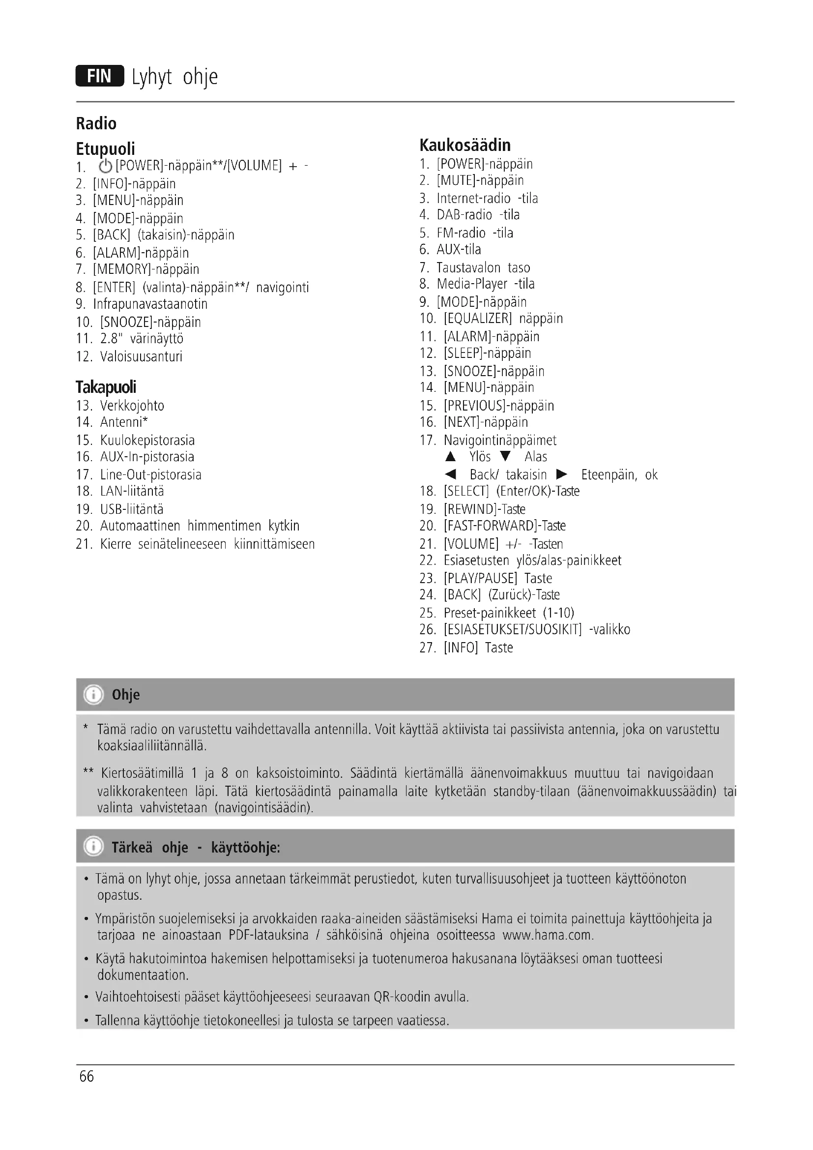 - Tämä radio on varustettu vaihdettavalla antennilla. Voit käyttää aktiivista tai passiivista antennia, joka on varustettu koaksiaaliliitännällä. ** Kiertosäätimillä 1 ja 8 on kaksoistoiminto. Säädintä kiertämällä äänenvoimakkuus muuttuu tai navigoidaan valikkorakenteen läpi. Tätä kiertosäädintä painamalla laite kytketään standby-tilaan (äänenvoimakkuussäädin) tai valinta vahvistetaan (navigointisäädin). Tärkeä ohje - käyttöohje: