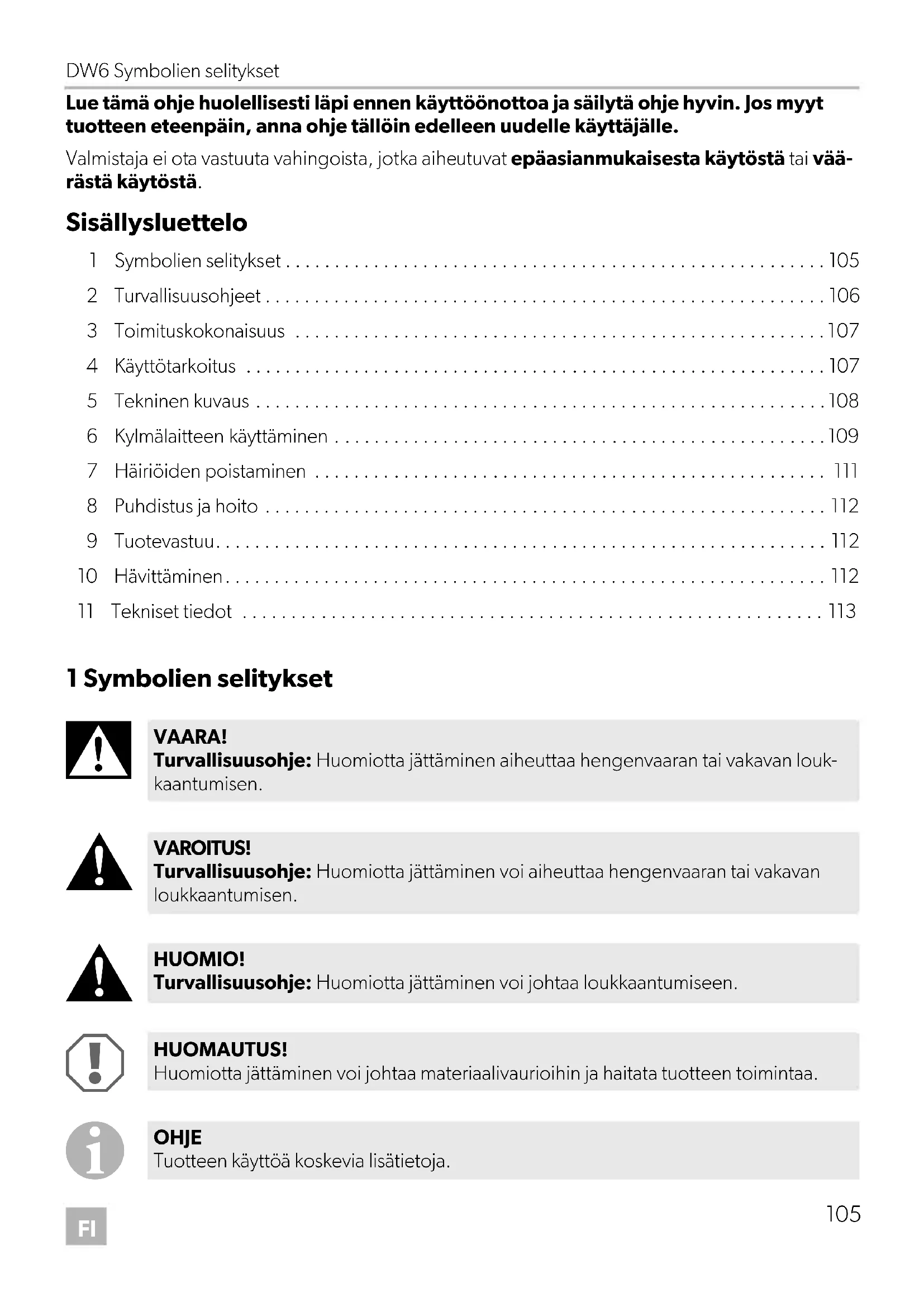 - Lue tämä ohje huolellisesti läpi ennen käyttöönottoa ja säilytä ohje hyvin. Jos myyt tuotteen eteenpäin, anna ohje tällöin edelleen uudelle käyttäjälle. Valmistaja ei ota vastuuta vahingoista, jotka aiheutuvat epäasianmukaisesta käytöstä tai vää- rästä käytöstä. Sisällysluettelo 1 Symbolien selitykset p. 105
