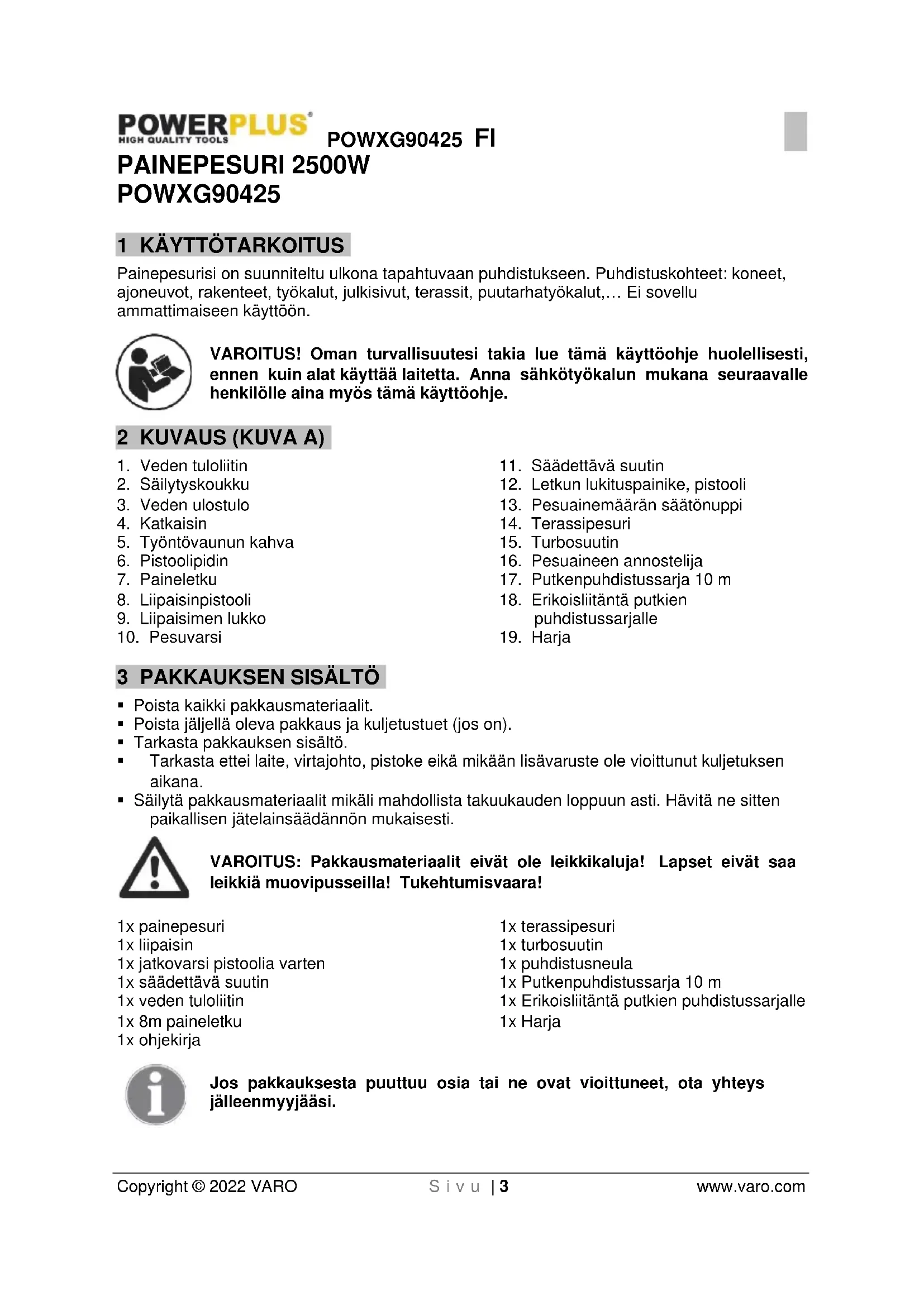 - Säilytä pakkausmateriaalit mikäli mahdollista takuukauden loppuun asti. Hävitä ne sitten paikallisen jätelainsäädännön mukaisesti. VAROITUS: Pakkausmateriaalit eivät ole leikkikaluja! Lapset eivät saa leikkiä muovipusseilla! Tukehtumisvaara! 1x painepesuri 1x liipaisin 1x jatkovarsi pistoolia varten 1x säädettävä suutin 1x veden tuloliitin 1x 8m paineletku 1x ohjekirja 1x terassipesuri 1x turbosuutin 1x puhdistusneula 1x Putkenpuhdistussarja 10 m 1x Erikoisliitäntä putkien puhdistussarjalle 1x Harja Jos pakkauksesta puuttuu osia tai ne ovat vioittuneet, ota yhteys jälleenmyyjääsi.POWXG90425 FI Copyright © 2022 VARO S i v u | 4 www.varo.com 4 SYMBOLIT Seuraavia symboleja käytetään tässä ohjekirjassa ja/tai koneen päällä: