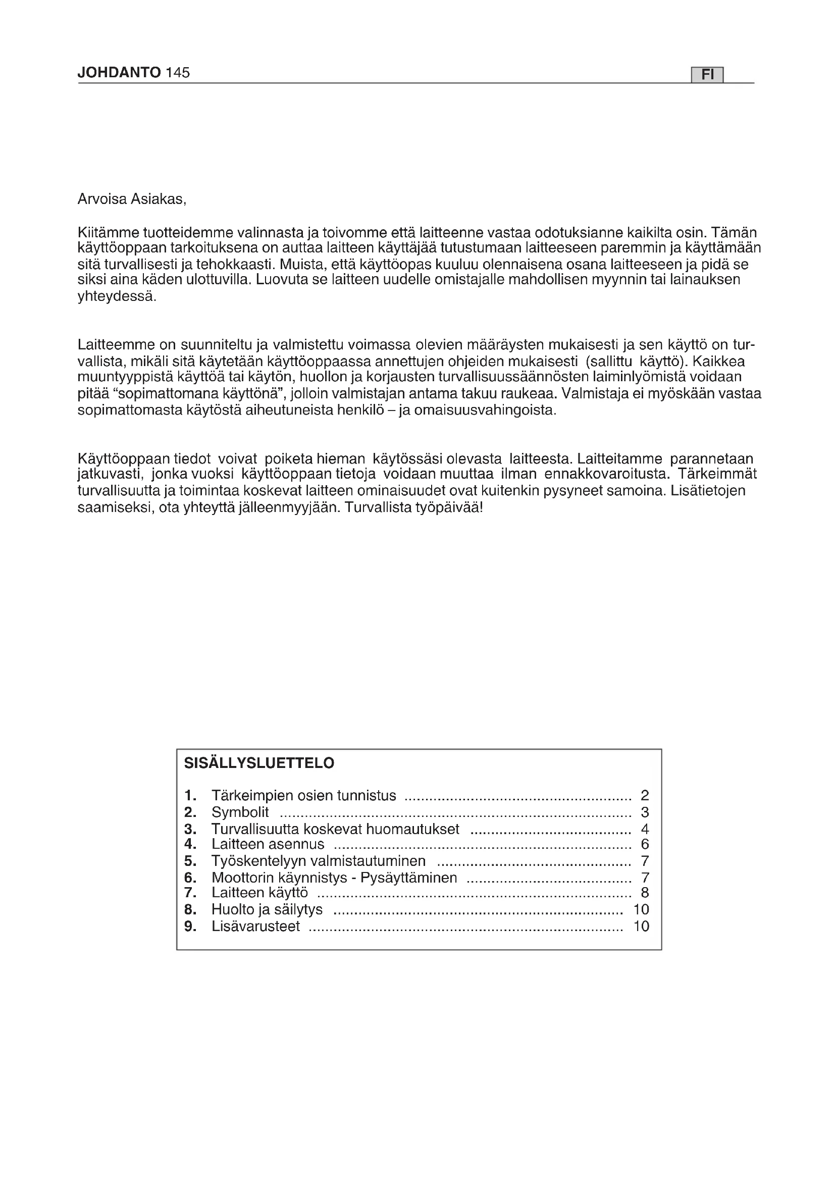 Nummer Model T 1.0 EJ 118801750/0 (M8 x 1,25 dx M)FI JOHDANTO 145 Arvoisa Asiakas, Kiitämme tuotteidemme valinnasta ja toivomme että laitteenne vastaa odotuksianne kaikilta osin. Tämän käyttöoppaan tarkoituksena on auttaa laitteen käyttäjää tutustumaan laitteeseen paremmin ja käyttämään sitä turvallisesti ja tehokkaasti. Muista, että käyttöopas kuuluu olennaisena osana laitteeseen ja pidä se siksi aina käden ulottuvilla. Luovuta se laitteen uudelle omistajalle mahdollisen myynnin tai lainauksen yhteydessä. Laitteemme on suunniteltu ja valmistettu voimassa olevien määräysten mukaisesti ja sen käyttö on tur- vallista, mikäli sitä käytetään käyttöoppaassa annettujen ohjeiden mukaisesti (sallittu käyttö). Kaikkea muuntyyppistä käyttöä tai käytön, huollon ja korjausten turvallisuussäännösten laiminlyömistä voidaan pitää “sopimattomana käyttönä”, jolloin valmistajan antama takuu raukeaa. Valmistaja ei myöskään vastaa sopimattomasta käytöstä aiheutuneista henkilö – ja omaisuusvahingoista. Käyttöoppaan tiedot voivat poiketa hieman käytössäsi olevasta laitteesta. Laitteitamme parannetaan jatkuvasti, jonka vuoksi käyttöoppaan tietoja voidaan muuttaa ilman ennakkovaroitusta. Tärkeimmät turvallisuutta ja toimintaa koskevat laitteen ominaisuudet ovat kuitenkin pysyneet samoina. Lisätietojen saamiseksi, ota yhteyttä jälleenmyyjään. Turvallista työpäivää! SISÄLLYSLUETTELO