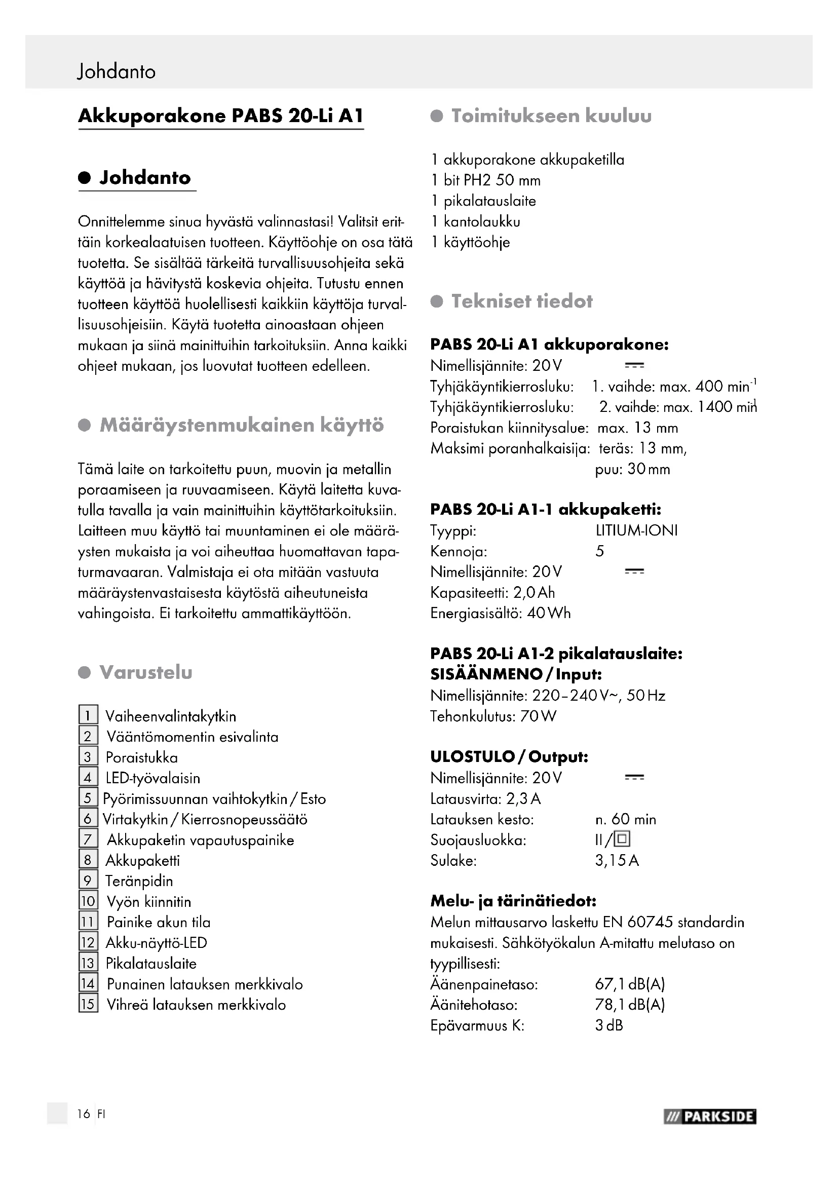 Poraistukan kiinnitysalue: max. 13 mm Maksimi poranhalkaisija: teräs: 13 mm, puu: 30 mm PABS 20-Li A1-1 akkupaketti: Tyyppi: LITIUM-IONI Kennoja: 5 Nimellisjännite: 20 V Kapasiteetti: 2,0 Ah Energiasisältö: 40 Wh PABS 20-Li A1-2 pikalatauslaite: SISÄÄNMENO / Input: Nimellisjännite: 220–240 V∼, 50 Hz Tehonkulutus: 70 W ULOSTULO / Output: Nimellisjännite: 20 V Latausvirta: 2,3 A Latauksen kesto: n. 60 min Suojausluokka: II / Sulake: 3,15 A Melu- ja tärinätiedot: Melun mittausarvo laskettu EN 60745 standardin mukaisesti. Sähkötyökalun A-mitattu melutaso on tyypillisesti: Äänenpainetaso: 67,1 dB(A) Äänitehotaso: 78,1 dB(A) Epävarmuus K: 3 dB Johdanto / Sähkötyökaluja koskevat yleiset turvaohjeet17 FI Johdanto / Sähkötyökaluja koskevat yleiset turvaohjeet Värähtelyn kokonaisarvot (kolmen suunnan vektori- summa) määritetty normin EN 60745 mukaan: Metalliin poraaminen: Värähtelyn päästöarvo a max. 1,088 m / s