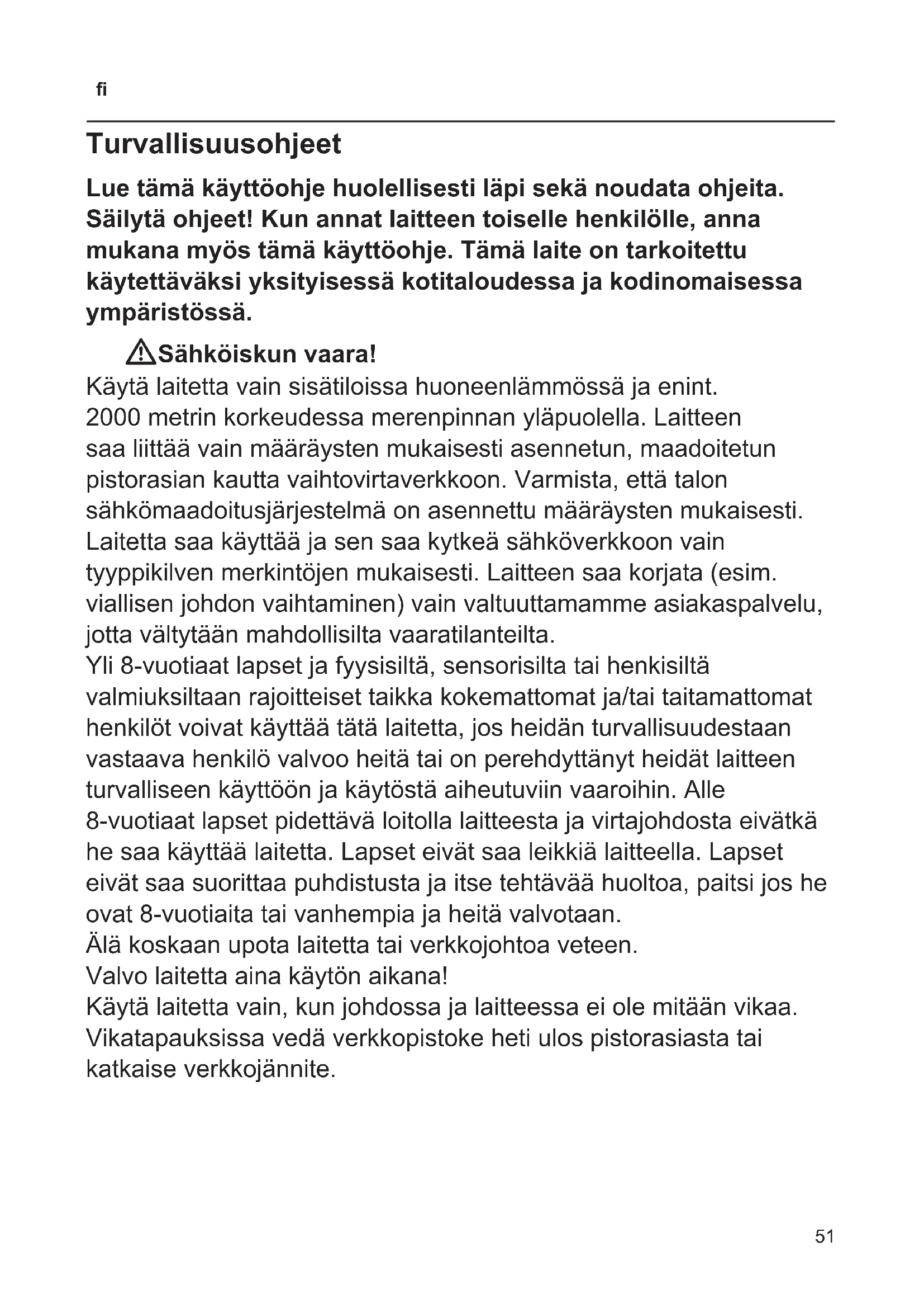 Turvallisuusohjeet Lue tämä käyttöohje huolellisesti läpi sekä noudata ohjeita. Säilytä ohjeet! Kun annat laitteen toiselle henkilölle, anna mukana myös tämä käyttöohje. Tämä laite on tarkoitettu käytettäväksi yksityisessä kotitaloudessa ja kodinomaisessa ympäristössä. WSähköiskun vaara! Käytä laitetta vain sisätiloissa huoneenlämmössä ja enint. 2000 metrin korkeudessa merenpinnan yläpuolella. Laitteen saa liittää vain määräysten mukaisesti asennetun, maadoitetun pistorasian kautta vaihtovirtaverkkoon. Varmista, että talon sähkömaadoitusjärjestelmä on asennettu määräysten mukaisesti. Laitetta saa käyttää ja sen saa kytkeä sähköverkkoon vain tyyppikilven merkintöjen mukaisesti. Laitteen saa korjata (esim. viallisen johdon vaihtaminen) vain valtuuttamamme asiakaspalvelu, jotta vältytään mahdollisilta vaaratilanteilta. Yli 8-vuotiaat lapset ja fyysisiltä, sensorisilta tai henkisiltä valmiuksiltaan rajoitteiset taikka kokemattomat ja/tai taitamattomat henkilöt voivat käyttää tätä laitetta, jos heidän turvallisuudestaan vastaava henkilö valvoo heitä tai on perehdyttänyt heidät laitteen turvalliseen käyttöön ja käytöstä aiheutuviin vaaroihin. Alle 8-vuotiaat lapset pidettävä loitolla laitteesta ja virtajohdosta eivätkä he saa käyttää laitetta. Lapset eivät saa leikkiä laitteella. Lapset eivät saa suorittaa puhdistusta ja itse tehtävää huoltoa, paitsi jos he ovat 8-vuotiaita tai vanhempia ja heitä valvotaan. Älä koskaan upota laitetta tai verkkojohtoa veteen. Valvo laitetta aina käytön aikana! Käytä laitetta vain, kun johdossa ja laitteessa ei ole mitään vikaa. Vikatapauksissa vedä verkkopistoke heti ulos pistorasiasta tai katkaise verkkojännite.52