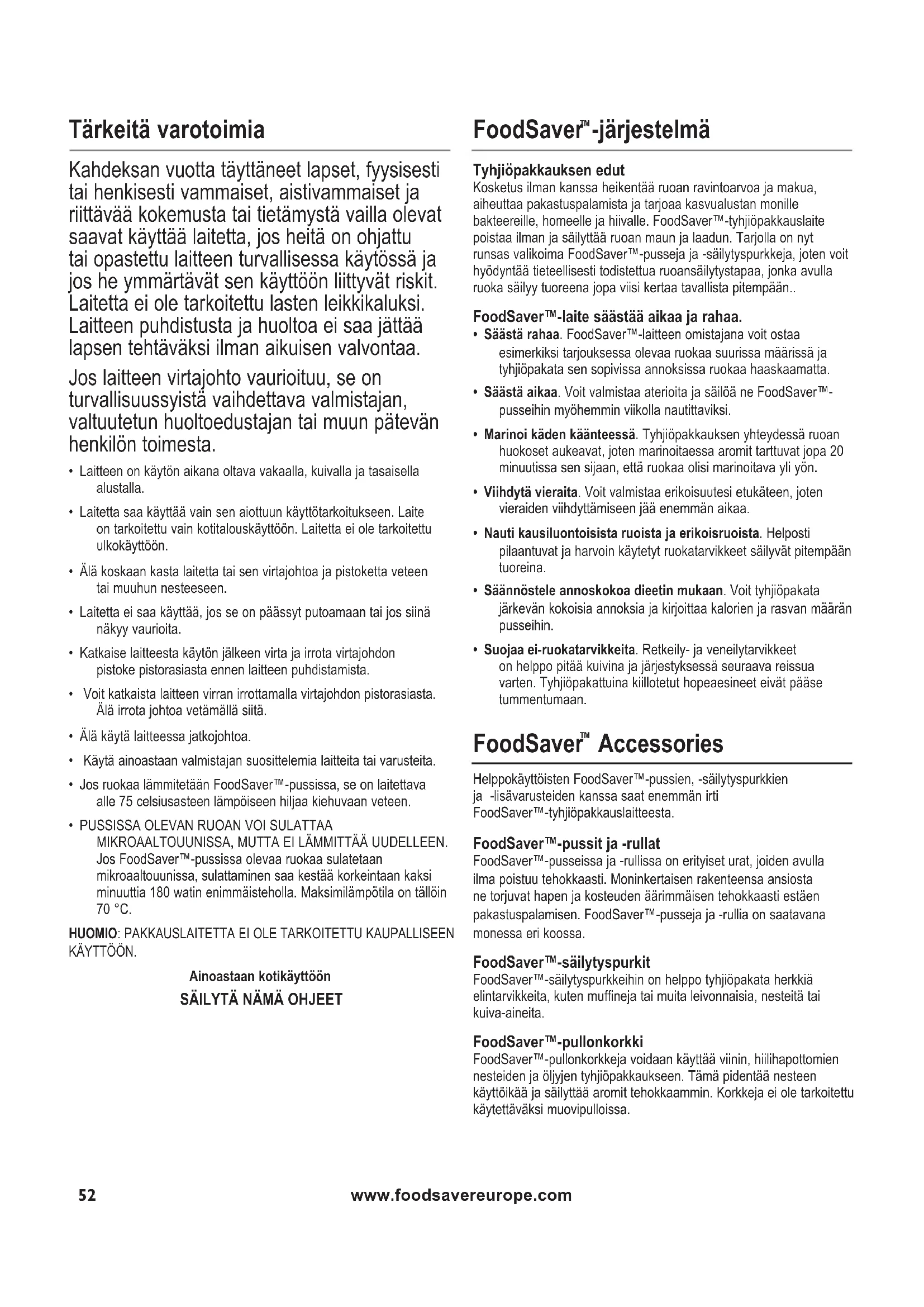 syttyy. Laite on ylikuumentunut. Odota ennen käyttöä, että varoitusvalo sammuu. Pumppu käy yli 2 minuuttia, mutta ilma ei poistu. Varmista, että pussin avoin pää on syötetty keruuastiaan. Varmista, että molemmat tiivisteet ovat kunnolla paikoillaan. Varmista, että vähintään toinen pussin pää on tiivistetty. Avaa yksikkö ja varmista, ettei ylä- eikä alatiivisteissä ole vieraita esineitä, likaa tai roskia. Varmista, että pussin yläosassa on tarpeeksi tilaa (75 mm), jotta se mahtuu keruuastiaan, kun kansi on suljettu ja lukittu. Varmista, ettei tarvikeletkua ole kiinnitetty. Varmista, että kansi on täysin suljettu (vihreä nauha näkyy salvan ympärillä ja vihreä virtavalo palaa). Pussi ei tiivisty kunnolla. Pussissa on liikaa nestettä. Pakasta pussin sisältö ennen tyhjiöpakkaamista. Voit estää sauman ryppyjä venyttämällä pussia varovasti litteäksi samalla, kun syötät pussin keruuastiaan, ja pitämällä kiinni pussista, kunnes tyhjiöpumppu käynnistyy. Varmista sauman pitävyys kosteaa ruokaa pakattaessa tekemällä toinen sauma pussin ensimmäisen sauman ylle. Kun salpa on suljettu ja painiketta Tyhjiöpakkaa ja sulje tai painiketta Sulje painetaan, mitään ei tapahdu. Varmista, että kansi on täysin suljettu (vihreä nauha näkyy salvan ympärillä ja vihreä virtavalo palaa). Vianmäärityswww.foodsavereurope.com