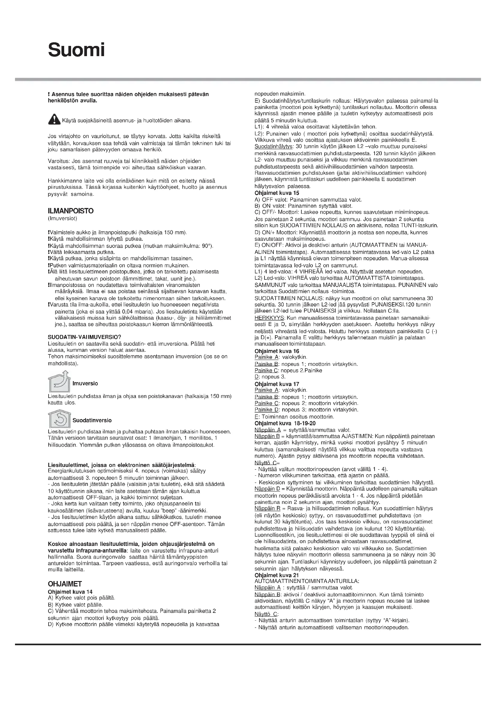Käytä suojakäsineitä asennus- ja huoltotöiden aikana. Jos virtajohto on vaurioitunut, se täytyy korvata. Jotta kaikilta riskeiltä vältytään, korvauksen saa tehdä vain valmistaja tai tämän tekninen tuki tai joku samanlaisen pätevyyden omaava henkilö. Varoitus: Jos asennat ruuveja tai kiinnikkeitä näiden ohjeiden vastaisesti, tämä toimenpide voi aiheuttaa sähköiskun vaaran. Hankkimanne laite voi olla erinäköinen kuin mitä on esitetty näissä piirustuksissa. Tässä kirjassa kuitenkin käyttöohjeet, huolto ja asennus pysyvät samoina. ILMANPOISTO (Imuversiot) ! Valmistele aukko ja ilmanpoistoputki (halkaisija 150 mm). ! Käytä mahdollisimman lyhyttä putkea. ! Käytä mahdollisimman suoraa putkea (mutkan maksimikulma: 90°). ! Vältä leikkaamasta putkea. ! Käytä putkea, jonka sisäpinta on mahdollisimman tasainen. ! Putken valmistusmateriaalin on oltava normien mukainen. ! Älä liitä liesituulettimeen poistoputkea, jotka on tarkoitettu palamisesta aiheutuvan savun poistoon (lämmittimet, takat, uunit jne.). ! Ilmanpoistossa on noudatettava toimivaltaisten viranomaisten määräyksiä. Ilmaa ei saa poistaa seinässä sijaitsevan kanavan kautta, ellei kyseinen kanava ole tarkoitettu nimenomaan siihen tarkoitukseen. ! Varusta tila ilma-aukoilla, ettei liesituuletin luo huoneeseen negatiivista painetta (joka ei saa ylittää 0,04 mbaria). Jos liesituuletinta käytetään väliaikaisesti muissa kuin sähkölaitteissa (kaasu-, öljy- ja hiililämmittimet jne.), saattaa se aiheuttaa poistokaasun kierron lämmönlähteestä. SUODATIN- VAI IMUVERSIO? Liesituuletin on saatavilla sekä suodatin- että imuversiona. Päätä heti alussa, kumman version haluat asentaa. Tehon maksimoimiseksi suosittelemme asentamaan imuversion (jos se on mahdollista). Imuversio Liesituuletin puhdistaa ilman ja ohjaa sen poistokanavan (halkaisija 150 mm) kautta ulos. Suodatinversio Liesituuletin puhdistaa ilman ja puhaltaa puhtaan ilman takaisin huoneeseen. Tähän versioon tarvitaan seuraavat osat: 1 ilmanohjain, 1 moniliitos, 1 hiilisuodatin. Ylemmän putken yläosassa on oltava ilmanpoistoaukot. Liesituulettimet, joissa on elektroninen säätöjärjestelmä: Energiankulutuksen optimoimiseksi 4. nopeus (voimakas) säätyy automaattisesti 3. nopeuteen 5 minuutin toiminnan jälkeen. - Jos liesituuletin jätetään päälle (valaisin ja/tai tuuletin), eikä sitä säädetä 10 käyttötunnin aikana, niin laite asetetaan tämän ajan kuluttua automaattisesti OFF-tilaan, ja kaikki toiminnot suljetaan. - Joka kerta kun valitaan tietty toiminto, joko ohjauspaneelin tai kaukosäätimen (lisävarusteena) avulla, kuuluu ”beep” -äänimerkki. - Jos liesituulettimen käytön aikana sattuu sähkökatkos, tuuletin menee automaattisesti pois päältä, ja sen näppäin menee OFF-asentoon. Tämän sattuessa tulee laite kytkeä manuaalisesti päälle. Koskee ainoastaan liesituulettimia, joiden ohjausjärjestelmä on varustettu infrapuna-antureilla: laite on varustettu infrapuna-anturi hallinnalla. Suora auringonvalo saattaa häiritä tämäntyyppisten antureiden toimintaa. Tarpeen vaatiessa, estä auringonvalo verhoilla tai muilla laitteilla. OHJAIMET Ohjaimet kuva 14 A) Kytkee valot pois päältä. B) Kytkee valot päälle. C) Vähentää moottorin tehoa maksimitehosta. Painamalla painiketta 2 sekunnin ajan moottori kytkeytyy pois päältä. D) Kytkee moottorin päälle viimeksi käytetyllä nopeudella ja kasvattaa nopeuden maksimiin. E) Suodatinhälytys/tuntilaskurin nollaus: Hälytysvalon palaessa painamal-la painiketta (moottori pois kytkettynä) tuntilaskuri nollautuu. Moottorin ollessa käynnissä ajastin menee päälle ja tuuletin kytkeytyy automaattisesti pois päältä 5 minuutin kuluttua. L1): 4 vihreää valoa osoittavat käytettävän tehon. L2): Punainen valo ( moottori pois kytkettynä) osoittaa suodatinhälytystä. Vilkkuva vihreä valo osoittaa ajastuksen aktivoinnin painikkeella E. Suodatinhälytys: 30 tunnin käytön jälkeen L2 –valo muuttuu punaiseksi merkkinä rasvasuodattimien puhdistustarpeesta. 120 tunnin käytön jälkeen L2- valo muuttuu punaiseksi ja vilkkuu merkkinä rasvasuodattimien puhdistustarpeesta sekä aktiivihiilisuodattimien vaihdon tarpeesta. Rasvasuodattimien puhdistuksen (ja/tai aktiivihiilisuodattimien vaihdon) jälkeen, käynnistä tuntilaskuri uudelleen painikkeella E suodattimen hälytysvalon palaessa. Ohjaimet kuva 15 A) OFF valot: Painaminen sammuttaa valot. B) ON valot: Painaminen sytyttää valot. C) OFF/- Moottori: Laskee nopeutta, kunnes saavutetaan miniminopeus. Jos painetaan 2 sekuntia, moottori sammuu. Jos painetaan 2 sekuntia silloin kun SUODATTIMIEN NOLLAUS on aktiivisena, nollaa TUNTI-laskurin. D) ON/+ Moottori: Käynnistää moottorin ja nostaa sen nopeutta, kunnes saavutetaan maksiminopeus. E) ON/OFF: Aktivoi ja deaktivoi anturin (AUTOMAATTINEN tai MANUA- ALINEN toimintatapa). Automaattisessa toimintatavassa led-valo L2 palaa ja L1 näyttää käynnissä olevan toimenpiteen nopeuden. Manua-alisessa toimintatavassa led-valo L2 on sammunut. L1) 4 led-valoa: 4 VIHREÄÄ led-valoa. Näyttävät asetetun nopeuden. L2) Led-valo: VIHREÄ valo tarkoittaa AUTOMAATTISTA toimintatapaa. SAMMUNUT valo tarkoittaa MANUAALISTA toimintatapaa. PUNAINEN valo tarkoittaa Suodattimien nollaus -toimintoa. SUODATTIMIEN NOLLAUS: näkyy kun moottori on ollut sammuneena 30 sekuntia. 30 tunnin jälkeen L2-led jää pysyvästi PUNAISEKSI.120 tunnin jälkeen L2-led tulee PUNAISEKSI ja vilkkuu. Nollataan C:lla. HERKKYYS: Kun manuaalisessa toimintatavassa painetaan samanaikai- sesti E ja D, siirrytään herkkyyden asetukseen. Asetettu herkkyys näkyy neljästä vihreästä led-valosta. Haluttu herkkyys asetetaan painikkeilla C (-) ja D(+). Painamalla E valittu herkkyys tallennetaan muistiin ja palataan manuaaliseen toimintatapaan. Ohjaimet kuva 16 Painike A: valokytkin. Painike B: nopeus 1; moottorin virtakytkin. Painike C: nopeus 2.Painike D: nopeus 3. Ohjaimet kuva 17 Pain