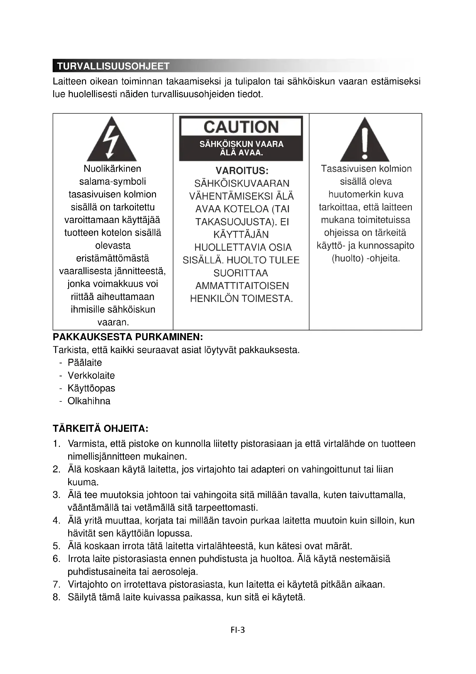 SÄHKÖISKUVAARAN VÄHENTÄMISEKSI ÄLÄ AVAA KOTELOA (TAI TAKASUOJUSTA). EI KÄYTTÄJÄN HUOLLETTAVIA OSIA SISÄLLÄ. HUOLTO TULEE SUORITTAA AMMATTITAITOISEN HENKILÖN TOIMESTA.
