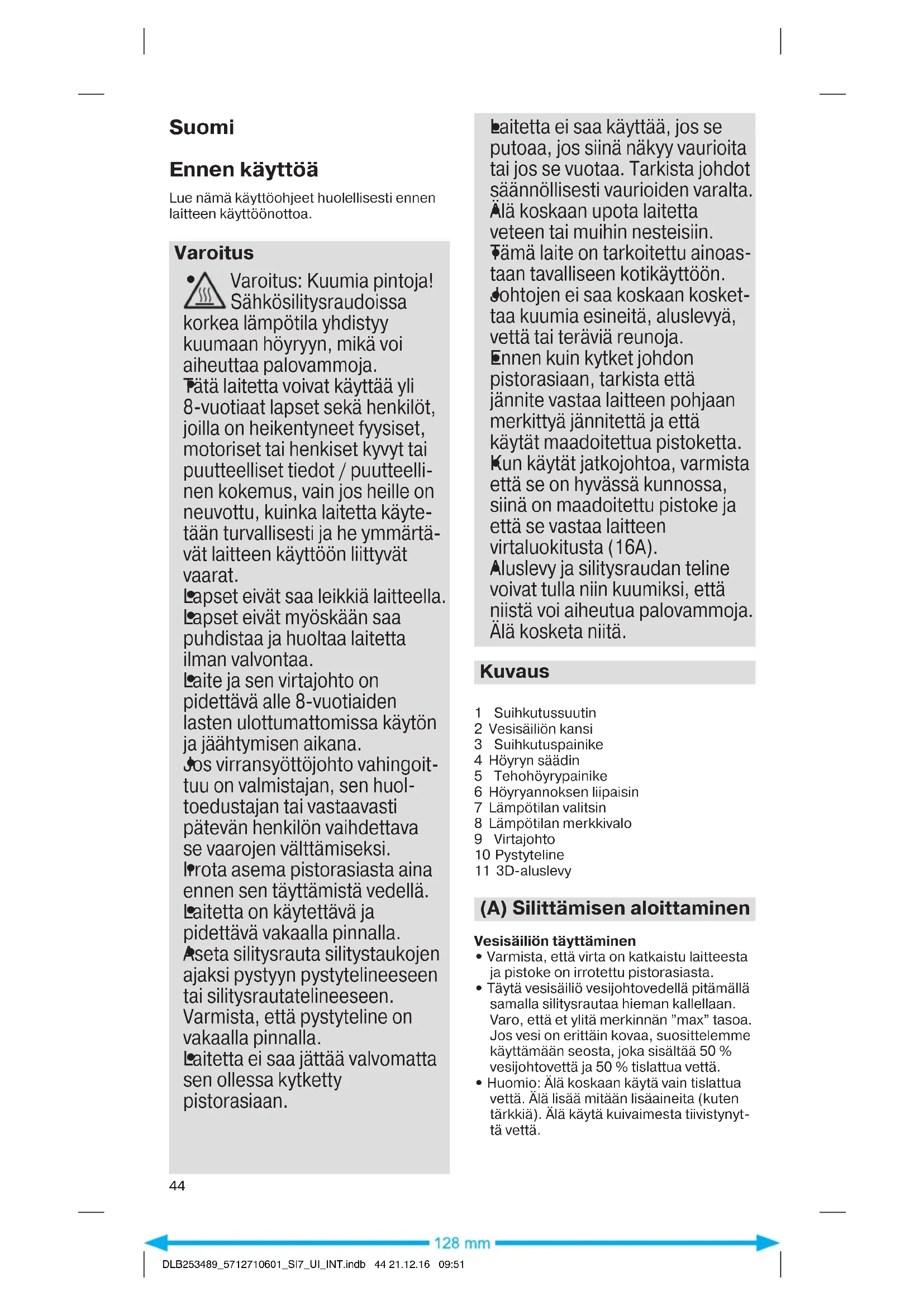 DLB253489_5712710601_SI7_UI_INT.indb 43 21.12.16 09:51Suomi Ennen käyttöä Lue nämä käyttöohjeet huolellisesti ennen laitteen käyttöönottoa. Varoitus