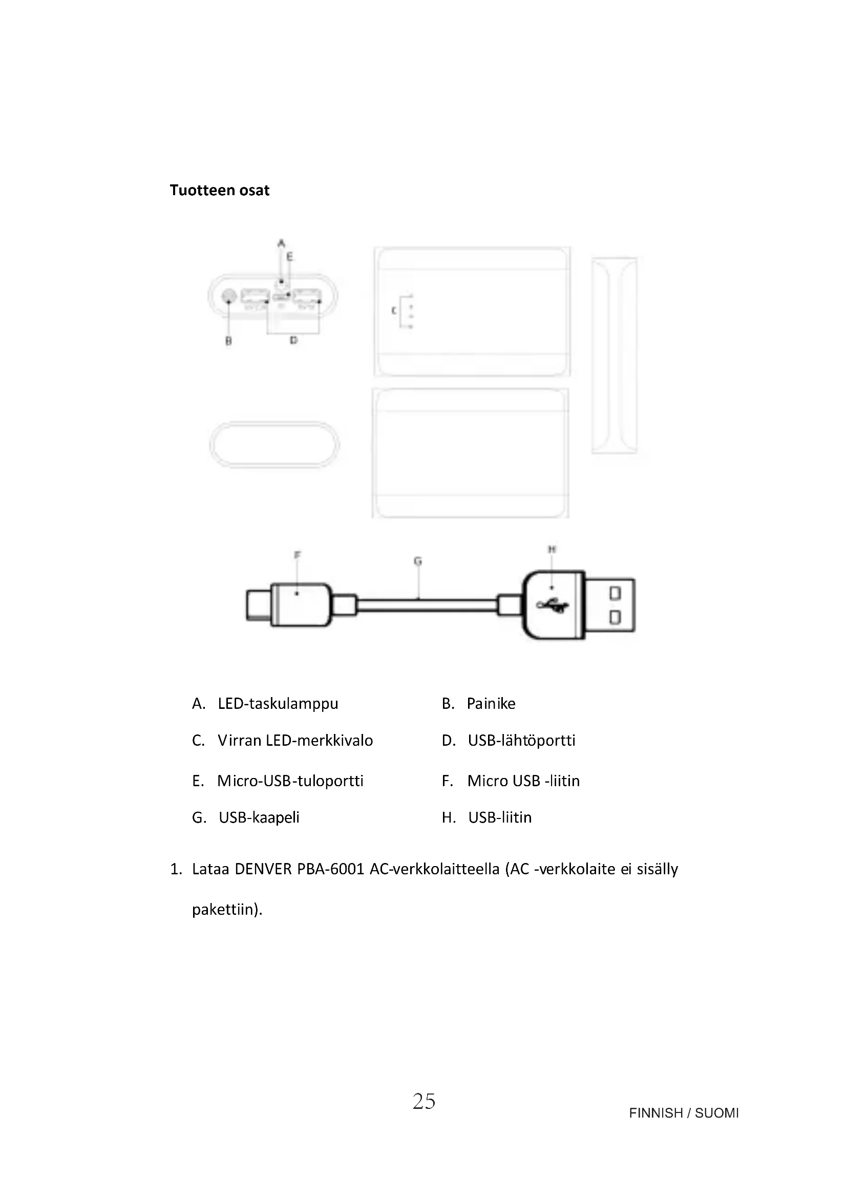 - Lataa DENVER PBA-6001 AC-verkkolaitteella (AC -verkkolaite ei sisäly pakettiin).