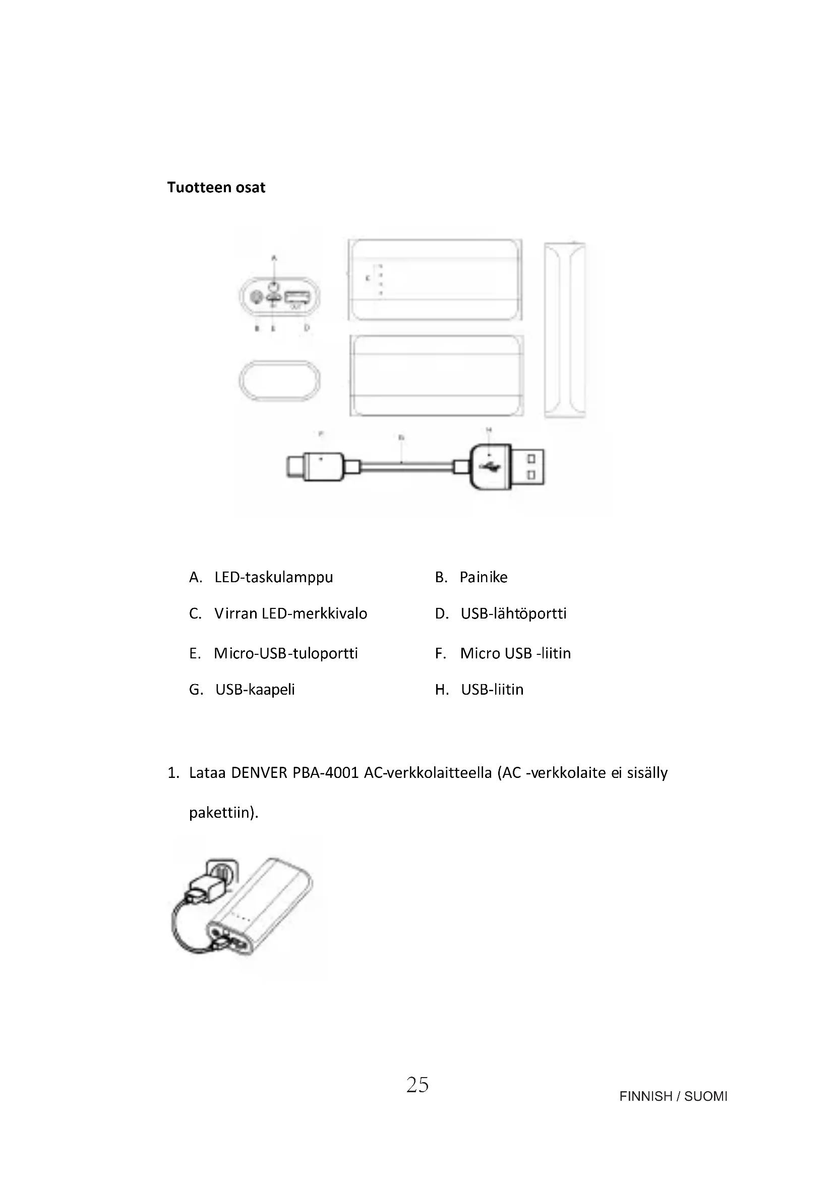 - Lataa DENVER PBA-4001 AC-verkkolaitteella (AC -verkkolaite ei sisälly pakettiin).