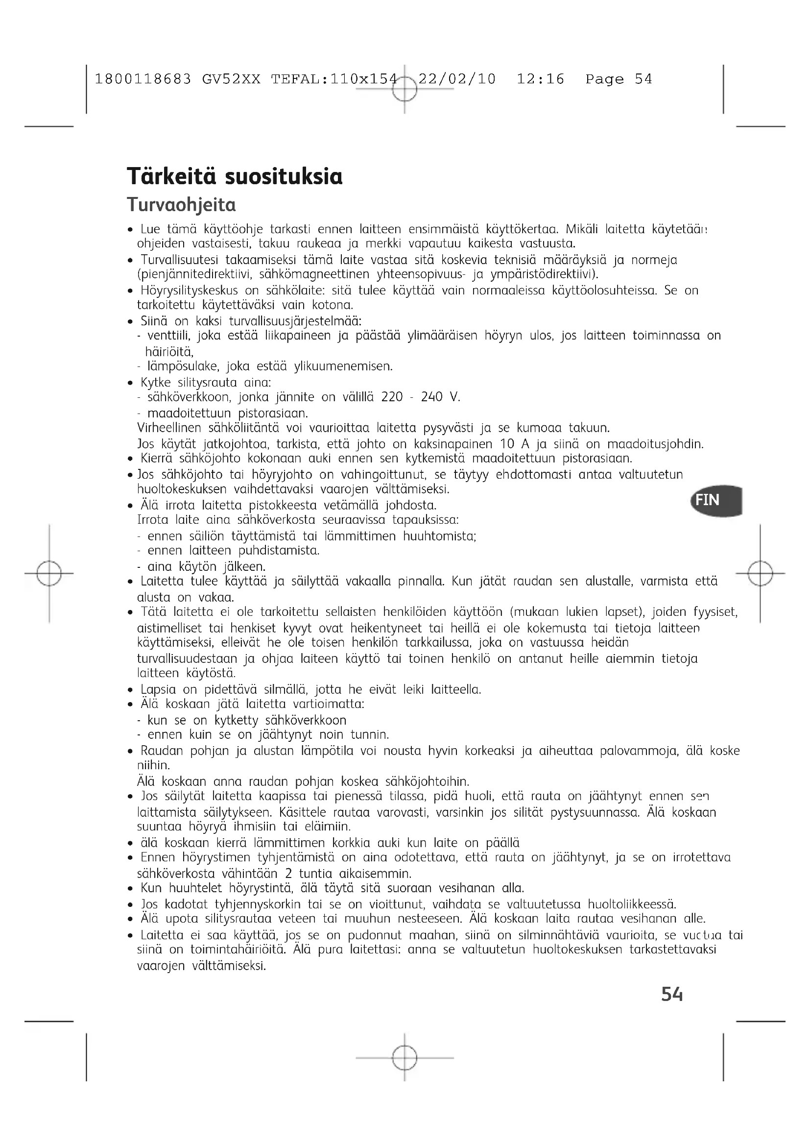 Jos silität arkoja seoskankaita, säädälämpötila herkimmän kuidun mukaan.Jos silität villavaatteita, paina raudanhöyryvalitsinta - fig.6 sykäyksittäin,älä laita rautaa vaateelle. Näin se eiala kiiltää.Muodostuva höyry on erittäin kuu-maa, älä koskaan poista ryppyjä vaat-teista henkilön päällä, käytä ainavaateripustinta. Jos käsittelet muitamateriaaleja kuin pellavaa tai puuvil-laa, pidä rauta muutaman senttime-trin päässä, jotta kangas ei pala.Älä koskaankierrä läm-mittimenkorkkia aukiniin kauankuin rau-dasta tuleehöyryä. 1800118683 GV52XX TEFAL:110x154 22/02/10 12:16 Page 5657 Laita höyrygeneraattori säilytykseen