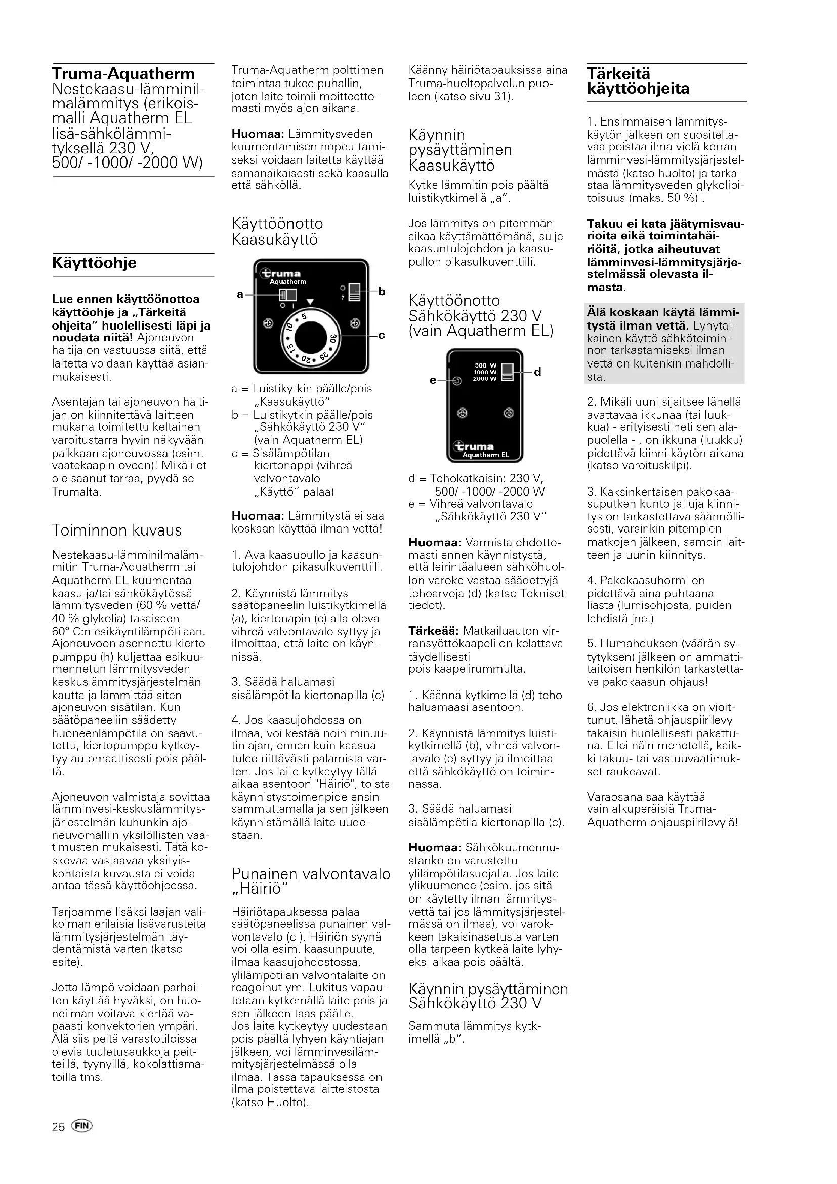 Käänny häiriötapauksissa aina Truma-huoltopalvelun puo- leen (katso sivu 31). Käynnin pysäyttäminen Kaasukäyttö Kytke lämmitin pois päältä luistikytkimellä „a“. Jos lämmitys on pitemmän aikaa käyttämättömänä, sulje kaasuntulojohdon ja kaasu- pullon pikasulkuventtiili. Käyttöönotto Sähkökäyttö 230 V (vain Aquatherm EL) d = Tehokatkaisin: 230 V, 500/ -1000/ -2000 W e = Vihreä valvontavalo „Sähkökäyttö 230 V“ Huomaa: Varmista ehdotto- masti ennen käynnistystä, että leirintäalueen sähköhuol- lon varoke vastaa säädettyjä tehoarvoja (d) (katso Tekniset tiedot). Tärkeää: Matkailuauton vir- ransyöttökaapeli on kelattava täydellisesti pois kaapelirummulta.