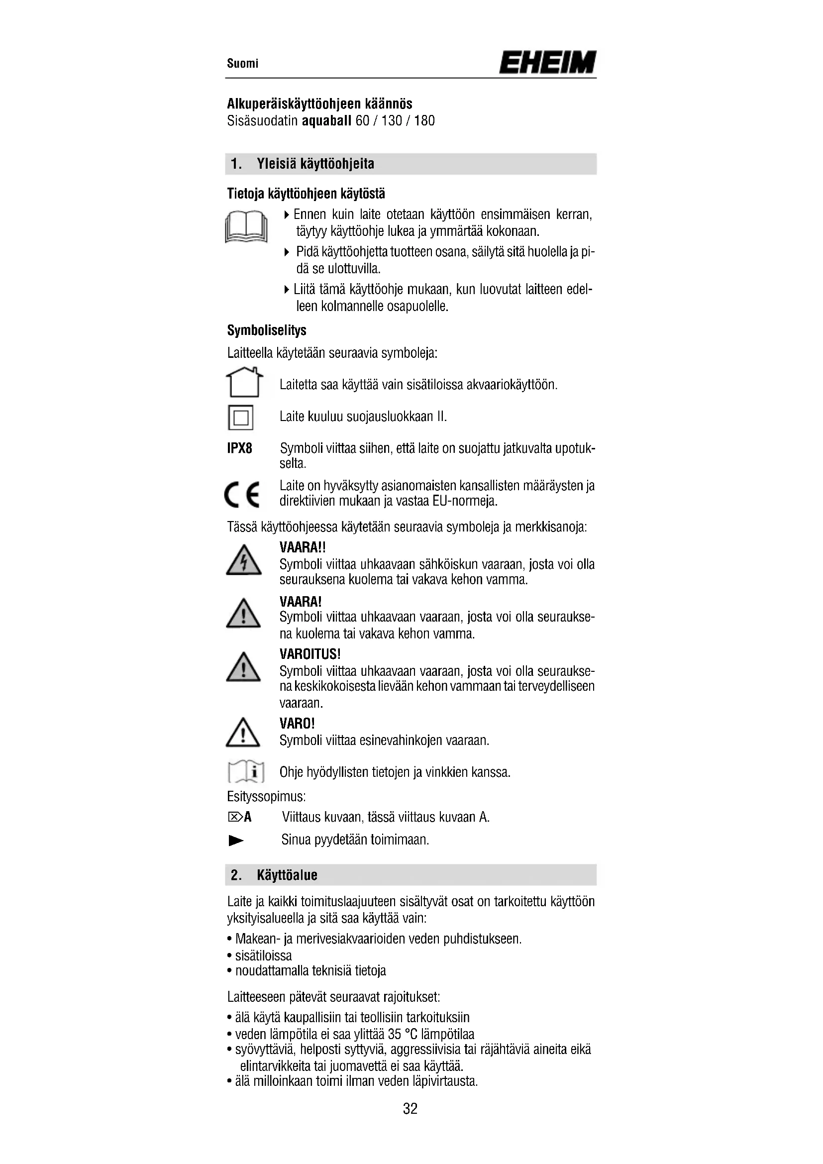 Tietoja käyttöohjeen käytöstä 4 Ennen kuin laite otetaan käyttöön ensimmäisen kerran, täytyy käyttöohje lukea ja ymmärtää kokonaan. 4 Pidä käyttöohjetta tuotteen osana, säilytä sitä huolella ja pi- dä se ulottuvilla. 4 Liitä tämä käyttöohje mukaan, kun luovutat laitteen edel- leen kolmannelle osapuolelle. Symboliselitys Laitteella käytetään seuraavia symboleja: Laitetta saa käyttää vain sisätiloissa akvaariokäyttöön. Laite kuuluu suojausluokkaan II. IPX8 Symboli viittaa siihen, että laite on suojattu jatkuvalta upotuk- selta. Laite on hyväksytty asianomaisten kansallisten määräysten ja direktiivien mukaan ja vastaa EU-normeja. Tässä käyttöohjeessa käytetään seuraavia symboleja ja merkkisanoja: VAARA!! Symboli viittaa uhkaavaan sähköiskun vaaraan, josta voi olla seurauksena kuolema tai vakava kehon vamma. VAARA! Symboli viittaa uhkaavaan vaaraan, josta voi olla seuraukse- na kuolema tai vakava kehon vamma. VAROITUS! Symboli viittaa uhkaavaan vaaraan, josta voi olla seuraukse- na keskikokoisesta lievään kehon vammaan tai terveydelliseen vaaraan. VARO! Symboli viittaa esinevahinkojen vaaraan. Ohje hyödyllisten tietojen ja vinkkien kanssa. Esityssopimus: ⌦A Viittaus kuvaan, tässä viittaus kuvaan A.
