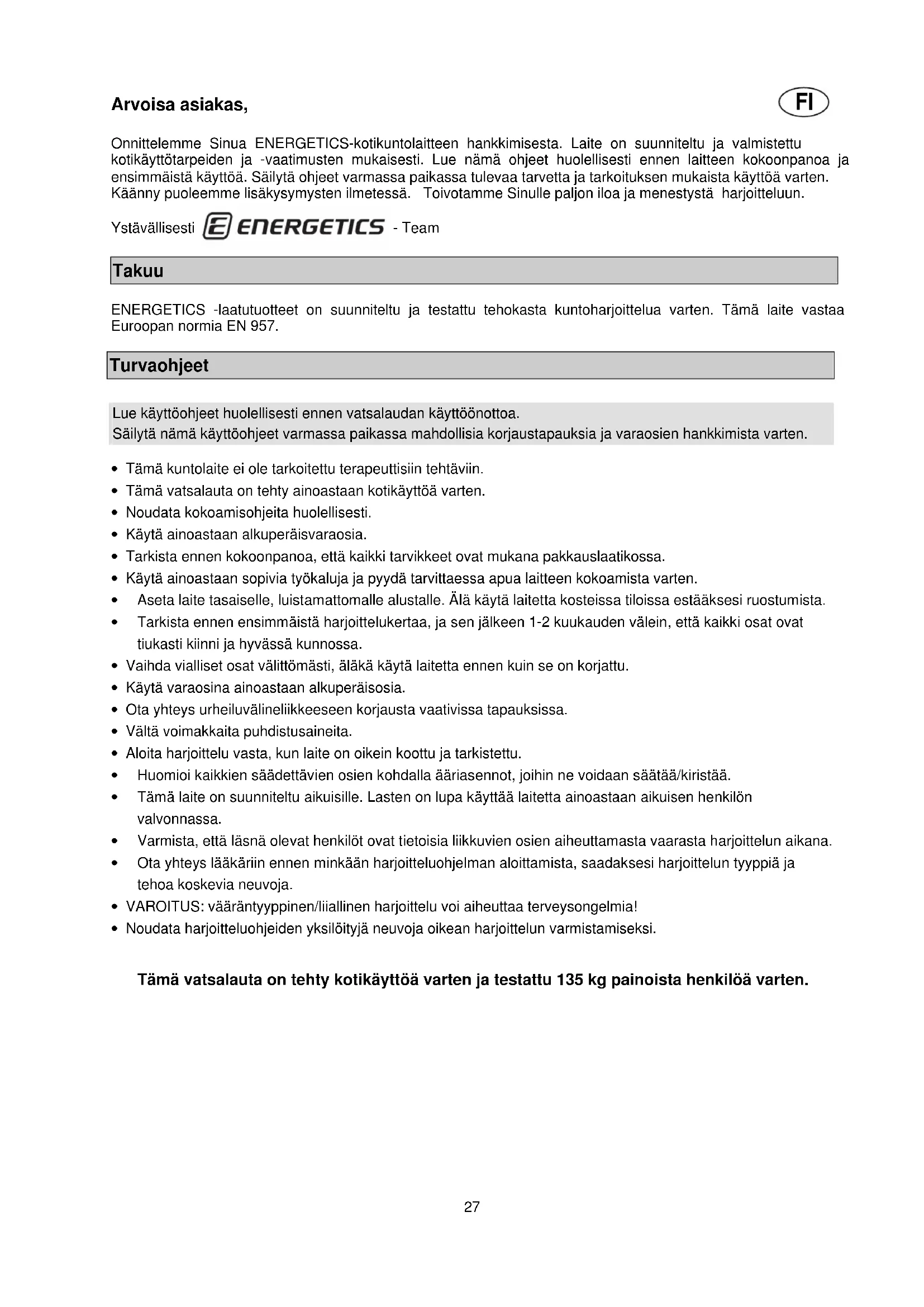 Arvoisa asiakas, Onnittelemme Sinua ENERGETICS-kotikuntolaitteen hankkimisesta. Laite on suunniteltu ja valmistettu kotikäyttötarpeiden ja -vaatimusten mukaisesti. Lue nämä ohjeet huolellisesti ennen laitteen kokoonpanoa ja ensimmäistä käyttöä. Säilytä ohjeet varmassa paikassa tulevaa tarvetta ja tarkoituksen mukaista käyttöä varten. Käänny puoleemme lisäkysymysten ilmetessä. Toivotamme Sinulle paljon iloa ja menestystä harjoitteluun. Ystävällisesti - Team Takuu ENERGETICS -laatutuotteet on suunniteltu ja testattu tehokasta kuntoharjoittelua varten. Tämä laite vastaa Euroopan normia EN 957. Turvaohjeet