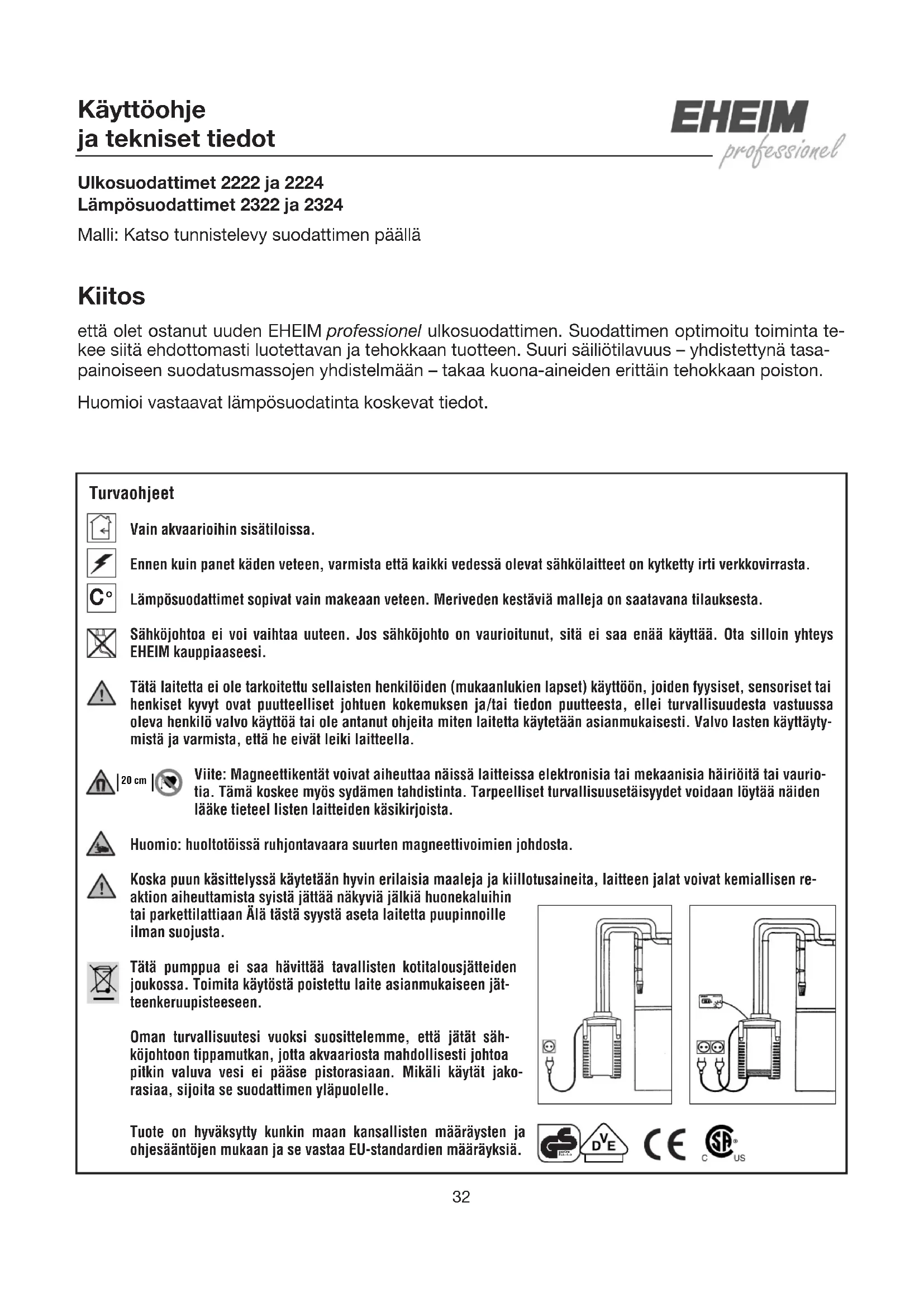 °32 Käyttöohje ja tekniset tiedot Ulkosuodattimet 2222 ja 2224 Lämpösuodattimet 2322 ja 2324 Malli: Katso tunnistelevy suodattimen päällä Kiitos että olet ostanut uuden EHEIM professionel ulkosuodattimen. Suodattimen optimoitu toiminta te- kee siitä ehdottomasti luotettavan ja tehokkaan tuotteen. Suuri säiliötilavuus – yhdistettynä tasa- painoiseen suodatusmassojen yhdistelmään – takaa kuona-aineiden erittäin tehokkaan poiston. Huomioi vastaavat lämpösuodatinta koskevat tiedot. Turvaohjeet Vain akvaarioihin sisätiloissa.Ennen kuin panet käden veteen, varmista että kaikki vedessä olevat sähkölaitteet on kytketty irti verkkovirrasta.Lämpösuodattimet sopivat vain makeaan veteen. Meriveden kestäviä malleja on saatavana tilauksesta. Sähköjohtoa ei voi vaihtaa uuteen. Jos sähköjohto on vaurioitunut, sitä ei saa enää käyttää. Ota silloin yhteys EHEIM kauppiaaseesi.Tätä laitetta ei ole tarkoitettu sellaisten henkilöiden (mukaanlukien lapset) käyttöön, joiden fyysiset, sensoriset tai henkiset kyvyt ovat puutteelliset johtuen kokemuksen ja/tai tiedon puutteesta, ellei turvallisuudesta vastuussa oleva henkilö valvo käyttöä tai ole antanut ohjeita miten laitetta käytetään asianmukaisesti. Valvo lasten käyttäyty-mistä ja varmista, että he eivät leiki laitteella.Viite: Magneettikentät voivat aiheuttaa näissä laitteissa elektronisia tai mekaanisia häiriöitä tai vaurio-tia. Tämä koskee myös sydämen tahdistinta. Tarpeelliset turvallisuusetäisyydet voidaan löytää näidenlääke tieteel listen laitteiden käsikirjoista.Huomio: huoltotöissä ruhjontavaara suurten magneettivoimien johdosta.Koska puun käsittelyssä käytetään hyvin erilaisia maaleja ja kiillotusaineita, laitteen jalat voivat kemiallisen re-aktion aiheuttamista syistä jättää näkyviä jälkiä huonekaluihintai parkettilattiaan Älä tästä syystä aseta laitetta puupinnoilleilman suojusta. Tätä pumppua ei saa hävittää tavallisten kotitalousjätteiden joukossa. Toimita käytöstä poistettu laite asianmukaiseen jät-teenkeruupisteeseen.Oman turvallisuutesi vuoksi suosittelemme, että jätät säh-köjohtoon tippamutkan, jotta akvaariosta mahdollisesti johtoapitkin valuva vesi ei pääse pistorasiaan. Mikäli käytät jako-rasiaa, sijoita se suodattimen yläpuolelle. Tuote on hyväksytty kunkin maan kansallisten määräysten jaohjesääntöjen mukaan ja se vastaa EU-standardien määräyksiä.