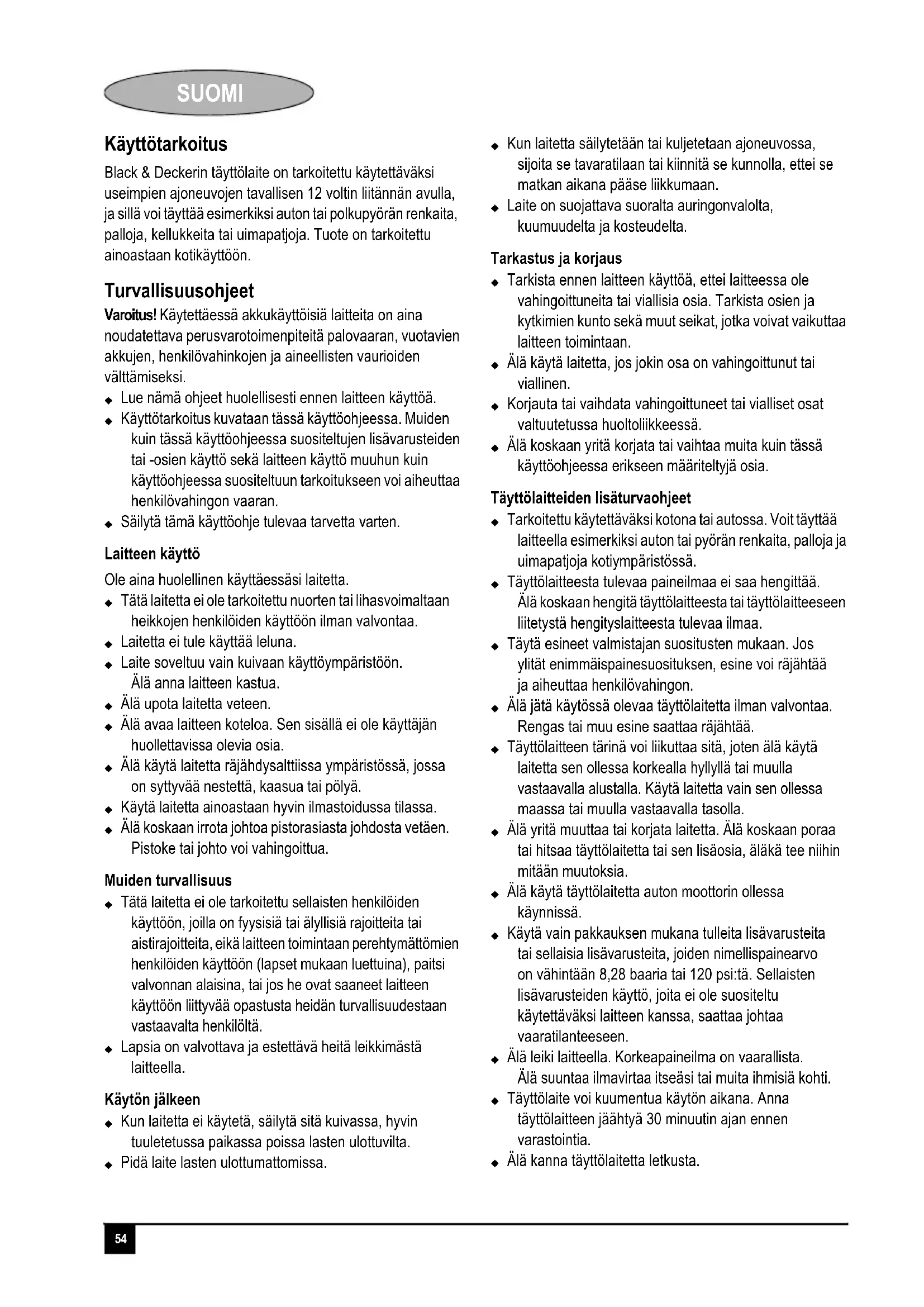 Black & Deckerin taytolaite on tarkoitetu käytettväksi useimpien ajoneuvojen ravallisen 12 voltin liitannan avulla, ja sillä voi tayttä esimerkiki autoh tai polkupyörän renkaita, palloja, kellukkeita tai uimapatjoja. Tuote on tarkoitetu ainoastaan kotikäyttoen.