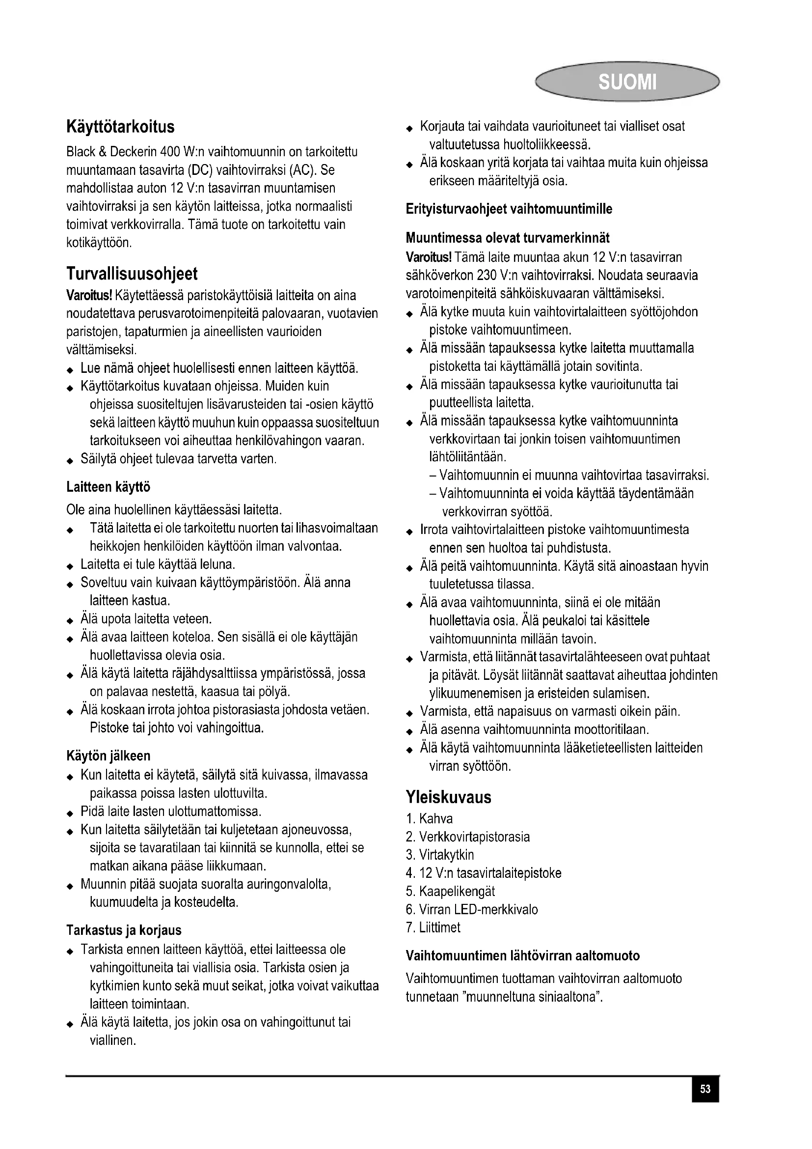 Black & Deckerin 400 W:n vaihtomuunnin on tarkoitettu muuntamaan tasavirta (DC) vaihtovirraksi (AC). Se mahdollistaa auton 12 V:n tasavirran muuntamisen vaihtovirraksi ja sen kayton laitteissa, jotka normalisti toimivat verkkovirralla. Tam tuote on tarkoitettu vain kotikayttoon.