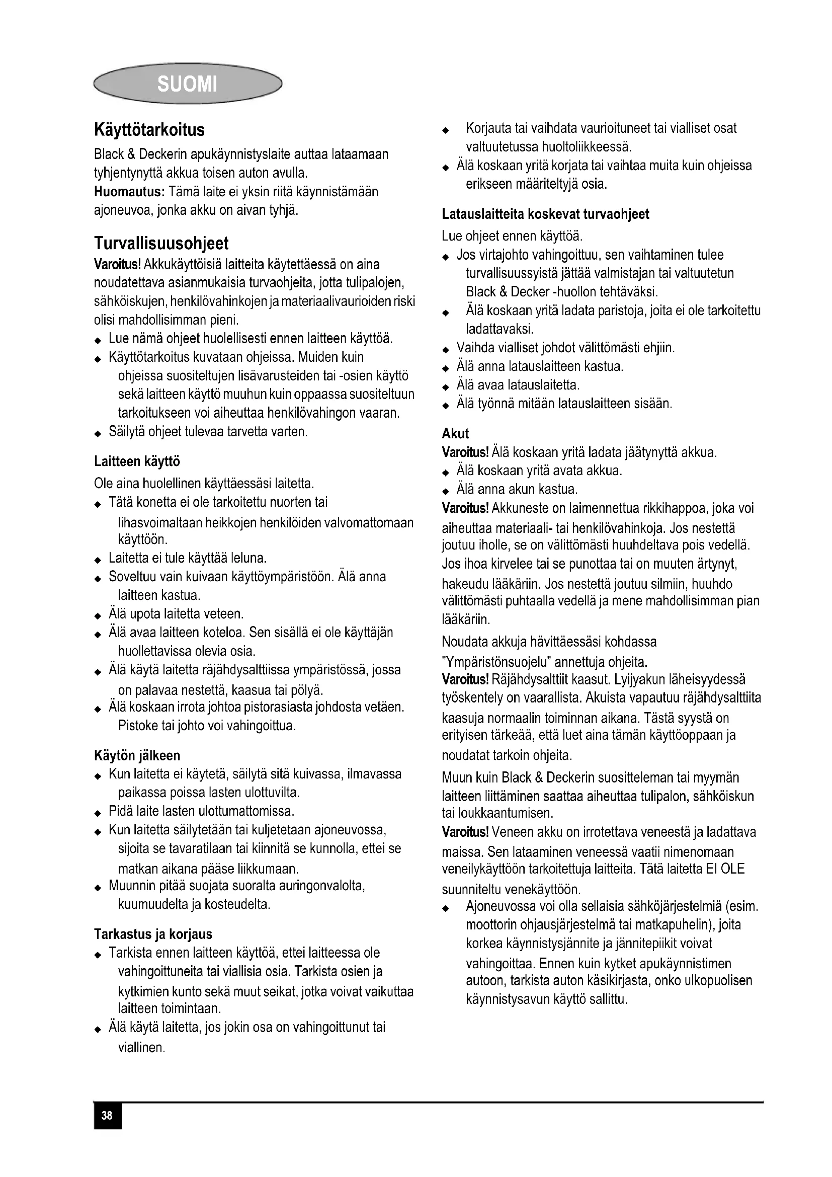 SUOMI Suomi Käyttötarkoitus Black & Deckerin apukäynnistyslaite auttaa lataamaan tyhjentynyttä akkua toisen auton avulla. Huomautus: Tämä laite ei yksin riitä käynnistämään ajoneuvoa, jonka akku on aivan tyhjä. Turvallisuusohjeet Varoitus! Akkukäyttöisiä laitteita käytettäessä on aina noudatettava asianmukaisia turvaohjeita, jotta tulipalojen, sähköiskujen, henkilövahinkojen ja materiaalivaurioiden riski olisi mahdollisimman pieni. X Lue nämä ohjeet huolellisesti ennen laitteen käyttöä. X Käyttötarkoitus kuvataan ohjeissa. Muiden kuin ohjeissa suositeltujen lisävarusteiden tai -osien käyttö sekä laitteen käyttö muuhun kuin oppaassa suositeltuun tarkoitukseen voi aiheuttaa henkilövahingon vaaran. X Säilytä ohjeet tulevaa tarvetta varten. Laitteen käyttö Ole aina huolellinen käyttäessäsi laitetta. X Tätä konetta ei ole tarkoitettu nuorten tai lihasvoimaltaan heikkojen henkilöiden valvomattomaan käyttöön. X Laitetta ei tule käyttää leluna. X Soveltuu vain kuivaan käyttöympäristöön. Älä anna laitteen kastua. X Älä upota laitetta veteen. X Älä avaa laitteen koteloa. Sen sisällä ei ole käyttäjän huollettavissa olevia osia. X Älä käytä laitetta räjähdysalttiissa ympäristössä, jossa on palavaa nestettä, kaasua tai pölyä. X Älä koskaan irrota johtoa pistorasiasta johdosta vetäen. Pistoke tai johto voi vahingoittua. Käytön jälkeen X Kun laitetta ei käytetä, säilytä sitä kuivassa, ilmavassa paikassa poissa lasten ulottuvilta. X Pidä laite lasten ulottumattomissa. X Kun laitetta säilytetään tai kuljetetaan ajoneuvossa, sijoita se tavaratilaan tai kiinnitä se kunnolla, ettei se matkan aikana pääse liikkumaan. X Muunnin pitää suojata suoralta auringonvalolta, kuumuudelta ja kosteudelta. Tarkastus ja korjaus X Tarkista ennen laitteen käyttöä, ettei laitteessa ole vahingoittuneita tai viallisia osia. Tarkista osien ja kytkimien kunto sekä muut seikat, jotka voivat vaikuttaa laitteen toimintaan. X Älä käytä laitetta, jos jokin osa on vahingoittunut tai viallinen. X Korjauta tai vaihdata vaurioituneet tai vialliset osat valtuutetussa huoltoliikkeessä. X Älä koskaan yritä korjata tai vaihtaa muita kuin ohjeissa erikseen määriteltyjä osia. Latauslaitteita koskevat turvaohjeet Lue ohjeet ennen käyttöä. X Jos virtajohto vahingoittuu, sen vaihtaminen tulee turvallisuussyistä jättää valmistajan tai valtuutetun Black & Decker -huollon tehtäväksi. X Älä koskaan yritä ladata paristoja, joita ei ole tarkoitettu ladattavaksi. X Vaihda vialliset johdot välittömästi ehjiin. X Älä anna latauslaitteen kastua. X Älä avaa latauslaitetta. X Älä työnnä mitään latauslaitteen sisään. Akut Varoitus! Älä koskaan yritä ladata jäätynyttä akkua. X Älä koskaan yritä avata akkua. X Älä anna akun kastua. Varoitus! Akkuneste on laimennettua rikkihappoa, joka voi aiheuttaa materiaali- tai henkilövahinkoja. Jos nestettä joutuu iholle, se on välittömästi huuhdeltava pois vedellä. Jos ihoa kirvelee tai se punottaa tai on muuten ärtynyt, hakeudu lääkäriin. Jos nestettä joutuu silmiin, huuhdo välittömästi puhtaalla vedellä ja mene mahdollisimman pian lääkäriin. Noudata akkuja hävittäessäsi kohdassa ”Ympäristönsuojelu” annettuja ohjeita. Varoitus! Räjähdysalttiit kaasut. Lyijyakun läheisyydessä työskentely on vaarallista. Akuista vapautuu räjähdysalttiita kaasuja normaalin toiminnan aikana. Tästä syystä on erityisen tärkeää, että luet aina tämän käyttöoppaan ja noudatat tarkoin ohjeita. Muun kuin Black & Deckerin suositteleman tai myymän laitteen liittäminen saattaa aiheuttaa tulipalon, sähköiskun tai loukkaantumisen. Varoitus! Veneen akku on irrotettava veneestä ja ladattava maissa. Sen lataaminen veneessä vaatii nimenomaan veneilykäyttöön tarkoitettuja laitteita. Tätä laitetta EI OLE suunniteltu venekäyttöön. X Ajoneuvossa voi olla sellaisia sähköjärjestelmiä (esim. moottorin ohjausjärjestelmä tai matkapuhelin), joita korkea käynnistysjännite ja jännitepiikit voivat vahingoittaa. Ennen kuin kytket apukäynnistimen autoon, tarkista auton käsikirjasta, onko ulkopuolisen käynnistysavun käyttö sallittu.39 SUOMI X Noudata annettuja ohjeita sekä niitä ohjeita, joita auton ja akun valmistaja sekä minkä tahansa muun, apukäynnistimen kanssa käytettävän laitteen valmistaja on antanut. Tarkista näiden tuotteiden ja ajoneuvon varoitusmerkinnät. X Tätä laitetta ei ole tarkoitettu korvaamaan ajoneuvon omaa akkua. Älä yritä käyttää ajoneuvoa, jossa ei ole akkua. X Laitteen saa kytkeä ainoastaan 12 V:n lyijyakkuun. Älä käytä sitä kodin sähkölaitteissa yleisesti käytettyjen kuivaparistojen tai akkujen lataamiseen. Ne voivat räjähtää ja aiheuttaa laite- ja henkilövahinkoja. Varoitus! Lyijyakusta voi latauksen aikana tulla räjähdysherkkää kaasua. Erityisen vaativissa oloissa on mahdollista, että akku vuotaa. Varmista, että apukäynnistimen käyttö- ja lataustilassa on kunnollinen ilmanvaihto. Laitteessa on seuraavat merkinnät: Yleiskuvaus