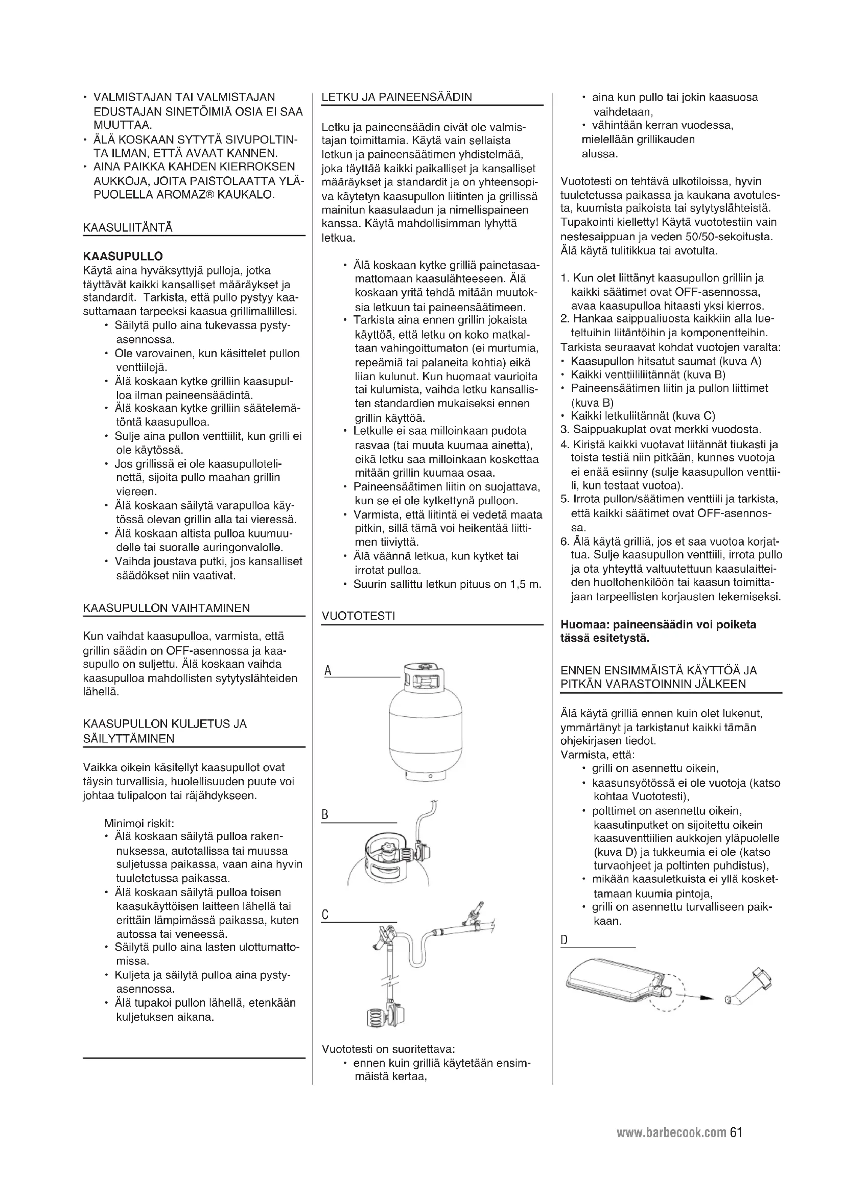 - vähintään kerran vuodessa, mielellään grillikauden alussa. Vuototesti on tehtävä ulkotiloissa, hyvin tuuletetussa paikassa ja kaukana avotules- ta, kuumista paikoista tai sytytyslähteistä. Tupakointi kielletty! Käytä vuototestiin vain nestesaippuan ja veden 50/50-sekoitusta. Älä käytä tulitikkua tai avotulta.