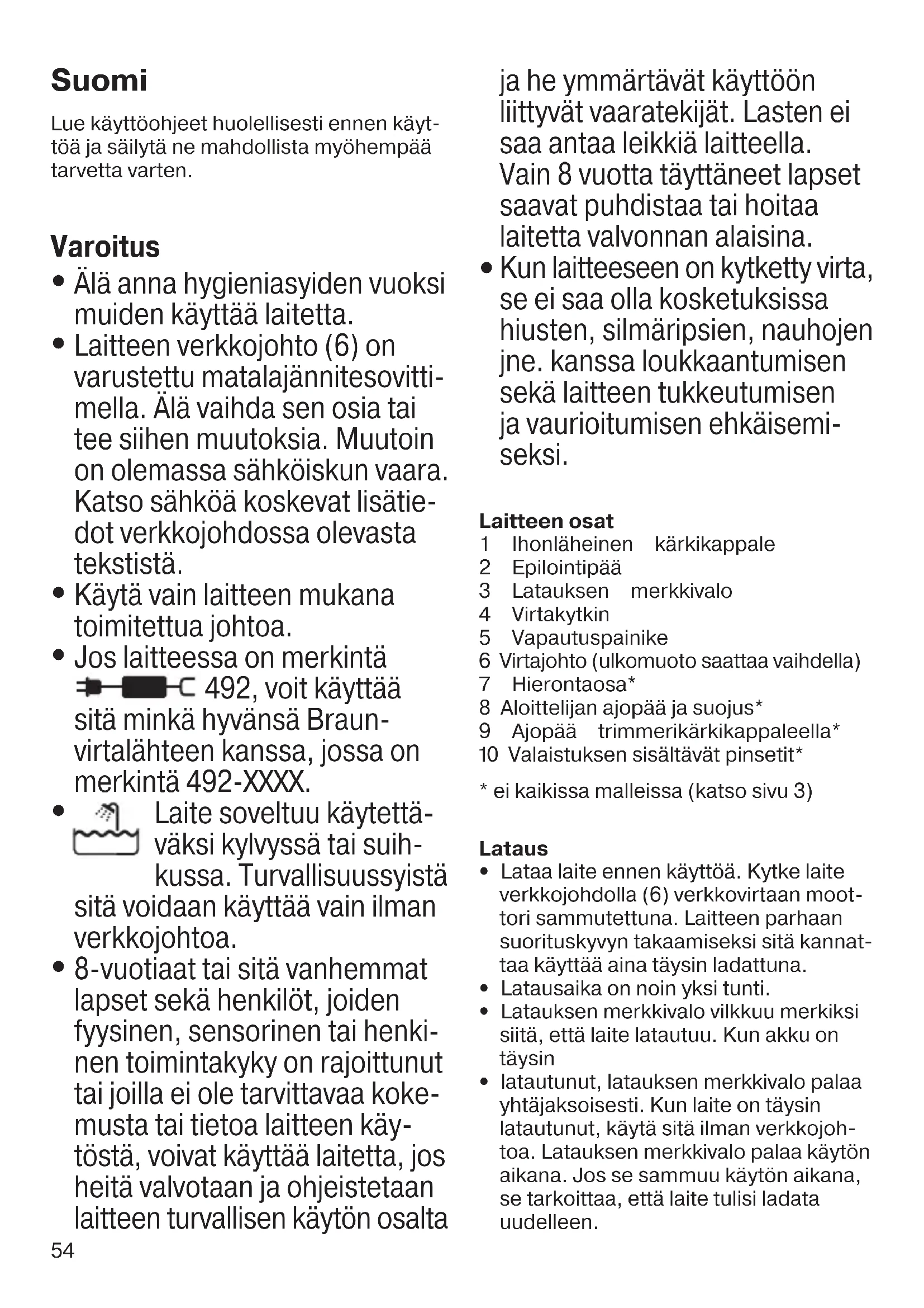 Kun laitteeseen on kytketty virta, se ei saa olla kosketuksissa hiusten, silmäripsien, nauhojen jne. kanssa loukkaantumisen sekä laitteen tukkeutumisen ja vaurioitumisen ehkäisemi- seksi. Laitteen osat 1 Ihonläheinen kärkikappale 2 Epilointipää 3 Latauksen merkkivalo 4 Virtakytkin 5 Vapautuspainike 6 Virtajohto (ulkomuoto saattaa vaihdella) 7 Hierontaosa* 8 Aloittelijan ajopää ja suojus* 9 Ajopää trimmerikärkikappaleella* 0 Valaistuksen sisältävät pinsetit*