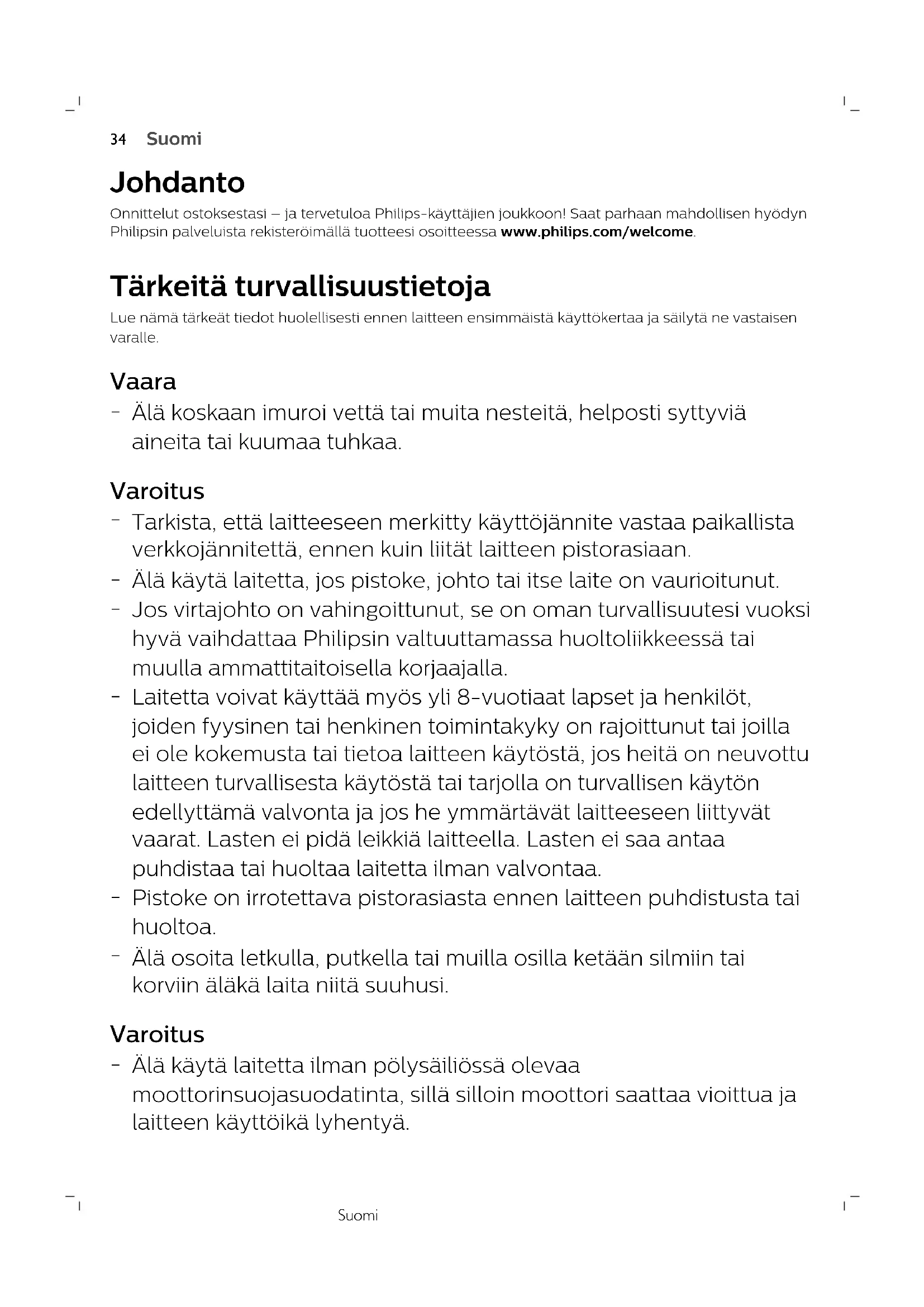 PortuguêsSuomi Johdanto Onnittelut ostoksestasi – ja tervetuloa Philips-käyttäjien joukkoon! Saat parhaan mahdollisen hyödynPhilipsin palveluista rekisteröimällä tuotteesi osoitteessa www.philips.com/welcome. Tärkeitä turvallisuustietoja Lue nämä tärkeät tiedot huolellisesti ennen laitteen ensimmäistä käyttökertaa ja säilytä ne vastaisenvaralle. Vaara
