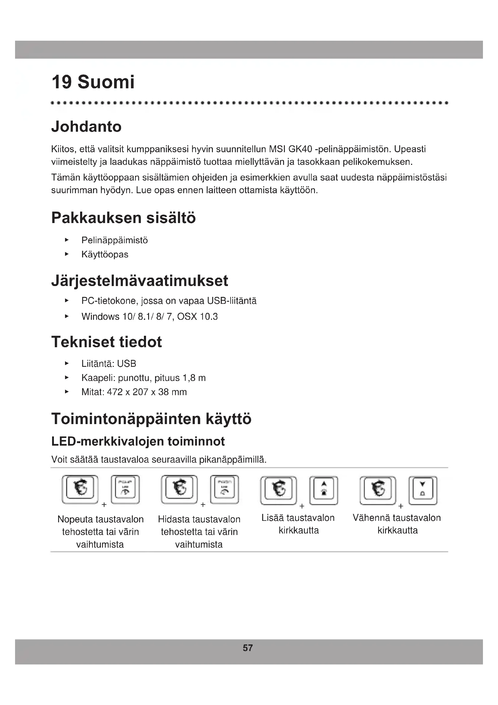 - Tryk på + eller for at justere farvetonen. Reference: Anti-ghosting Tab+Caps+Shift+Ctrl+Q+W+E+R+T+A+S+D+F+G+Z+X+C+V+B+mellemrum 20 taster Q+W+E+R+T+Y+U+I+O+P+mellemrum 11 taster A+S+D+F+G+H+J+K+L+; +mellemrum 11 taster Z+X+C+V+B+N+M+,+.+/+mellemrumtilbage 11 taster TAB+CAPS+Shift+Ctrl+Alt+Q+W+E+A+S+D+Z+X+C 14 taster TAB+CAPS+Shift+Ctrl+mellemrum+Q+W+E+A+S+D+F+G+Z+X+C+↑+←+↓+→ 20 taster Shift-L+Shift-R+Ctrl-L+Ctrl-R+Alt-L+Alt-R+mellemrum+↑+←+↓+→ 11 taster A+S+D+F+J+K+L+;+mellemrumtilbage 9 taster57 19 Suomi Johdanto Kiitos,ettävalitsitkumppaniksesihyvinsuunnitellunMSIGK40-pelinäppäimistön.Upeasti viimeisteltyjalaadukasnäppäimistötuottaamiellyttävänjatasokkaanpelikokemuksen. Tämänkäyttöoppaansisältämienohjeidenjaesimerkkienavullasaatuudestanäppäimistöstäsi suurimmanhyödyn.Lueopasennenlaitteenottamistakäyttöön. Pakkauksen sisältö ▶ Pelinäppäimistö ▶ Käyttöopas Järjestelmävaatimukset ▶ PC-tietokone, jossa on vapaa USB-liitäntä ▶ Windows 10/ 8.1/ 8/ 7, OSX 10.3 Tekniset tiedot ▶ Liitäntä: USB ▶ Kaapeli: punottu, pituus 1,8 m ▶ Mitat: 472 x 207 x 38 mm Toimintonäppäinten käyttö LED-merkkivalojen toiminnot Voit säätää taustavaloa seuraavilla pikanäppäimillä.