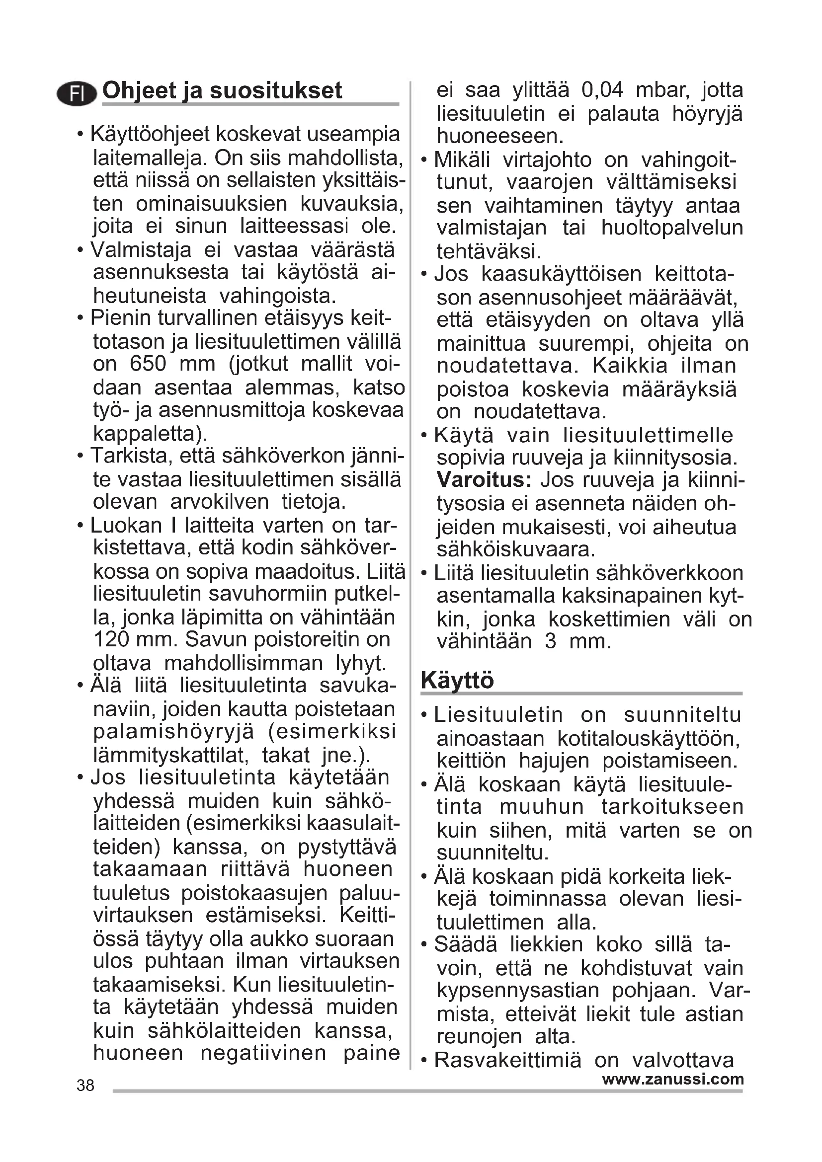- Rasvakeittimiä on valvottava FI39 www.zanussi.com jatkuvasti käytön aikana: yli- kuumentunut öljy voi syttyä palamaan.