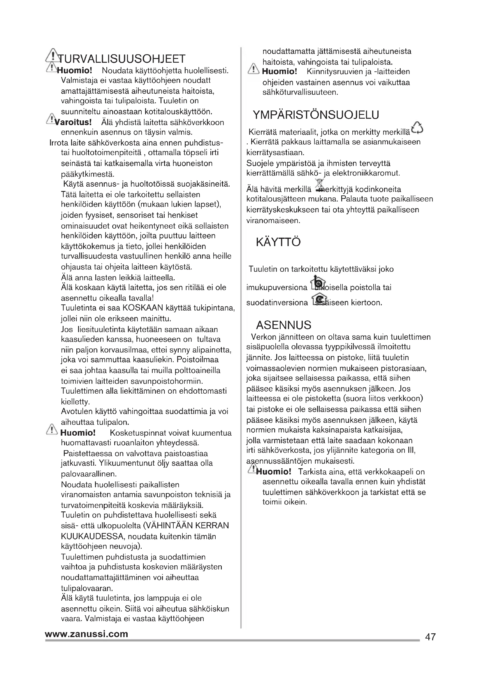 Kierrätä materiaalit, jotka on merkitty merkillä . Kierrätä pakkaus laittamalla se asianmukaiseen kierrätysastiaan. Suojele ympäristöä ja ihmisten terveyttä kierrättämällä sähkö- ja elektroniikkaromut. Älä hävitä merkillä merkittyjä kodinkoneita kotitalousjätteen mukana. Palauta tuote paikalliseen kierrätyskeskukseen tai ota yhteyttä paikalliseen viranomaiseen. KÄYTTÖ Tuuletin on tarkoitettu käytettäväksi joko imukupuversiona ulkoisella poistolla tai suodatinversiona sisäiseen kiertoon. ASENNUS Verkon jännitteen on oltava sama kuin tuulettimen sisäpuolella olevassa tyyppikilvessä ilmoitettu jännite. Jos laitteessa on pistoke, liitä tuuletin voimassaolevien normien mukaiseen pistorasiaan, joka sijaitsee sellaisessa paikassa, että siihen pääsee käsiksi myös asennuksen jälkeen. Jos laitteessa ei ole pistoketta (suora liitos verkkoon) tai pistoke ei ole sellaisessa paikassa että siihen pääsee käsiksi myös asennuksen jälkeen, käytä normien mukaista kaksinapaista katkaisijaa, jolla varmistetaan että laite saadaan kokonaan irti sähköverkosta, jos ylijännite kategoria on III, asennussääntöjen mukaisesti. Huomio! Tarkista aina, että verkkokaapeli on asennettu oikealla tavalla ennen kuin yhdistät tuulettimen sähköverkkoon ja tarkistat että se toimii oikein.48 www.zanussi.com Lieden keittotason tukipinnan ja keittiötuulettimen alimman osan välinen minimietäisyys on oltava vähintään 50cm sähköliesien osalta ja 65cm kaasu- ja sekaliesien osalta. Jos kaasulieden käyttöohjeissa vaaditaan suurempi etäisyys, on se otettava huomioon. HUOLTO Huomio! Irroita laite aina virtalähteestä ennen puhdistus- tai huoltotoimenpiteitä, irrota virtajohdon pistoke verkkovirtapistorasiasta tai katkaise virta kodin sähköverkosta. Tuuletin on puhdistettava usein sekä sisä- etttä ulkopuolelta (vähintään yhtä usein kuin rasvasuodattimien huolto). Käytä puhdistukseen neutraalissa nestemäisessä pesuaineessa kostutettua kangasta. Vältä hankaavia pesuaineita.