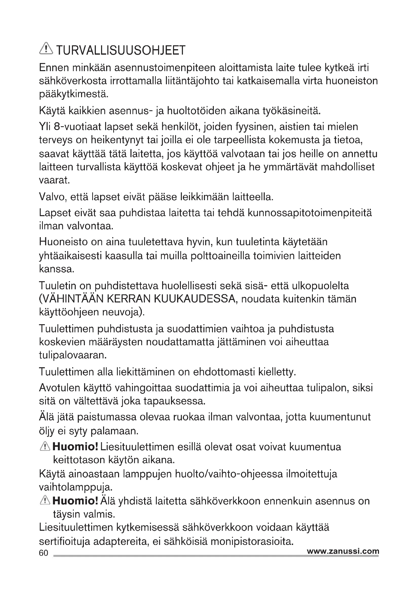 maksimal (5.). Bruk største hastighet ved høy dampkonsentrasjon på kjøkkenet. Vi anbefaler å slå på viften 5 minutter før du begynner å lage mat, og la den fortsette å virke i enda cirka 15 minutter etter du er ferdig med matlagingen. BELYSNING Ventilatoren er utstyrt med et belysningssystem basert på LED-teknologi. LED-lysene garanterer optimal belysning, har opptil 10 ganger lengre varighet enn tradisjonelle lyspærer og tillater en strømsparing på 90 %. Forsiktig! Ikke se direkte på LED-lyset. Henvend deg til teknisk service når LED-pærene skal skiftes ut.60 www.zanussi.com TURVALLISUUSOHJEET Ennen minkään asennustoimenpiteen aloittamista laite tulee kytkeä irti sähköverkosta irrottamalla liitäntäjohto tai katkaisemalla virta huoneiston pääkytkimestä. Käytä kaikkien asennus- ja huoltotöiden aikana työkäsineitä. Yli 8-vuotiaat lapset sekä henkilöt, joiden fyysinen, aistien tai mielen terveys on heikentynyt tai joilla ei ole tarpeellista kokemusta ja tietoa, saavat käyttää tätä laitetta, jos käyttöä valvotaan tai jos heille on annettu laitteen turvallista käyttöä koskevat ohjeet ja he ymmärtävät mahdolliset vaarat. Valvo, että lapset eivät pääse leikkimään laitteella. Lapset eivät saa puhdistaa laitetta tai tehdä kunnossapitotoimenpiteitä ilman valvontaa. Huoneisto on aina tuuletettava hyvin, kun tuuletinta käytetään yhtäaikaisesti kaasulla tai muilla polttoaineilla toimivien laitteiden kanssa. Tuuletin on puhdistettava huolellisesti sekä sisä- että ulkopuolelta (VÄHINTÄÄN KERRAN KUUKAUDESSA, noudata kuitenkin tämän käyttöohjeen neuvoja). Tuulettimen puhdistusta ja suodattimien vaihtoa ja puhdistusta koskevien määräysten noudattamatta jättäminen voi aiheuttaa tulipalovaaran. Tuulettimen alla liekittäminen on ehdottomasti kielletty. Avotulen käyttö vahingoittaa suodattimia ja voi aiheuttaa tulipalon, siksi sitä on vältettävä joka tapauksessa. Älä jätä paistumassa olevaa ruokaa ilman valvontaa, jotta kuumentunut öljy ei syty palamaan. Huomio! Liesituulettimen esillä olevat osat voivat kuumentua keittotason käytön aikana. Käytä ainoastaan lamppujen huolto/vaihto-ohjeessa ilmoitettuja vaihtolamppuja. Huomio! Älä yhdistä laitetta sähköverkkoon ennenkuin asennus on täysin valmis. Liesituulettimen kytkemisessä sähköverkkoon voidaan käyttää sertifioituja adaptereita, ei sähköisiä monipistorasioita.61 www.zanussi.com TURVAOHJEET Noudata huolellisesti paikallisten viranomaisten antamia savunpoiston teknisiä ja turvatoimenpiteitä koskevia määräyksiä. Poistoilmaa ei saa johtaa kaasulla tai muilla polttoaineilla toimivien laitteiden savunpoistohormiin. Älä käytä liesituuletinta, jos lamppu ei ole paikallaan tai jos lamppuja ei ole asennettu oikein, sillä seurauksena voi olla sähköisku. Älä koskaan käytä tuuletinta, jos sen verkkoa ei ole asennettu oikealla tavalla! Tuuletinta ei saa KOSKAAN käyttää tukipintana, jollei niin ole erikseen mainittu. Käytä vain laitteen mukana tulevia asennukseen tarkoitettuja kiinnitysruuveja, tai hanki oikeanlaisia ruuveja jos ne eivät kuulu varustukseen. Käytä Asennusohjeen mukaisia oikean pituisia ruuveja. Epäselvissä tapauksissa ota yhteys tekniseen tukeen tai vastaavaan asiantuntijaan. HUOMIO! Kiinnitysruuvien ja –laitteiden ohjeiden vastainen asennus voi vaikuttaa sähköturvallisuuteen.